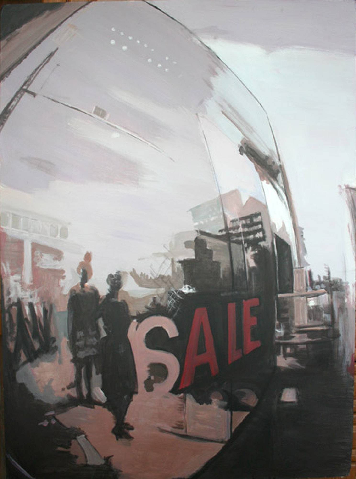Obraz przyciąga uwagę swoją niejednoznacznością i subtelnością. Kolorystyka jest stonowana, dominują odcienie szarości i brązu, a czerwień napisu "SALE" wprowadza wyraźny akcent. Kompozycja jest dynamiczna dzięki zakrzywionym liniom i przemyślanym odbiciom. Atmosfera jest nieco zagadkowa, jakby z innego świata. Czujemy lekki dystans, jakbyśmy patrzyli na codzienność przez zakrzywione lustro. Styl artystyczny przypomina impresjonizm, ale z nowoczesnym twistem. Pędzel jest użyty swobodnie, co dodaje energii i niejednoznaczności. Refleksy i cienie tworzą wrażenie głębi i ruchu. Można odnieść wrażenie chaosu, ale jednocześnie każdy element wydaje się być tam celowo. Obraz może wywoływać różne emocje. Dla jednych będzie to nostalgia, dla innych ciekawość. Interpretacje są szerokie: od refleksji nad konsumpcjonizmem po wspomnienia z dzieciństwa. Ja osobiście czuję pewien niepokój, ale też fascynację. Słowo "SALE" rzuca się w oczy jako call to action, zachęcające do zatrzymania się na chwilę. Czy ta promocja jest prawdziwa, czy to tylko chwyt marketingowy obrazu? A może to tylko zabawa oka? Nie wiem, ale jest super fAjne!