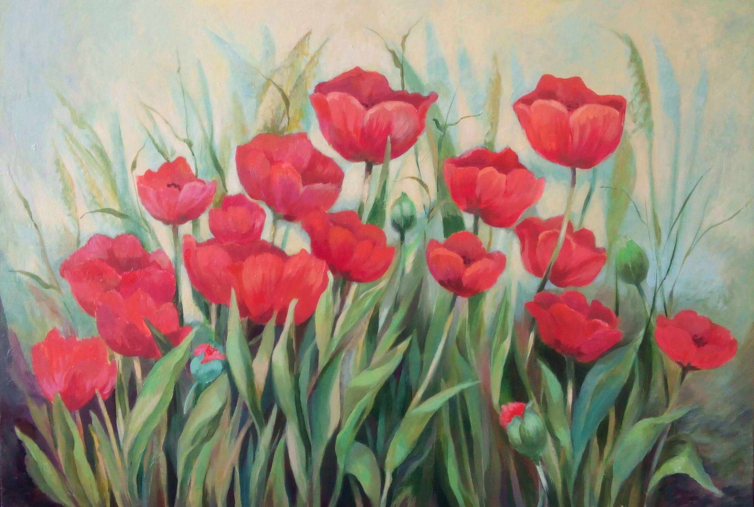 Na obrazie przedstawiono soczyste, czerwone tulipany kołyszące się na delikatnie zarysowanych łodygach. Ich kształty pełne są gracji, a płatki masują złote promienie światła, dodając im życia. Wrażenie jest takie, jakby kwiaty tańczyły na wietrze, a ich taniec pełen był radości i optymizmu. Tło, utrzymane w pastelowych odcieniach błękitu i zieleni, tworzy spokojną i harmonijną atmosferę, w której tulipany wydają się unosić. Artysta użył techniki impresjonizmu, co widać w lekkich pociągnięciach pędzla i subtelnych przejściach tonalnych. Patrząc na to, czuje się ciepło i radość, jakby każda chwila miała trwać wiecznie. Może wywoływać u widza wrażenie beztroskiej wiosny i nadziei. To prawdziwy feast for the eyes dla kogoś, kto kocha naturę. "Mama, te kwiatki są jak z bajki!", powiedziałby dzieciak. Ten obraz to jak cichy zakątek ogrodu, gdzie można na chwilę zatrzymać się i poczuć spokój.