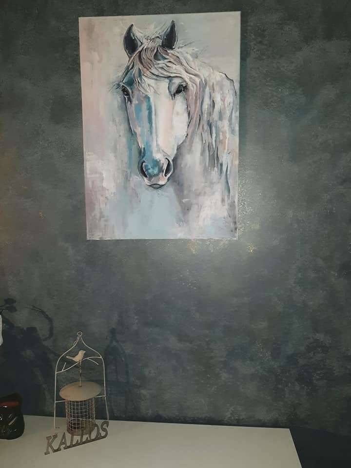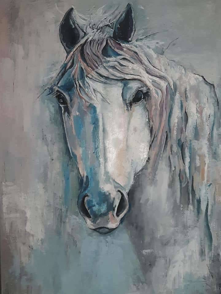 Obraz z serii Horselove- Siwek. To obraz olejny na płótnie naciągniety na drewniany blejtram. Posiada zamalowane boki, nie wymaga ramy. Obraz przedstawia patrzącego na nas z zaciekawieniem konia. Wyłania on się delikatnie z tła a jego niesforna grzywa tworzy piękne światłocienie. Obraz o wymiarach 60x50cm