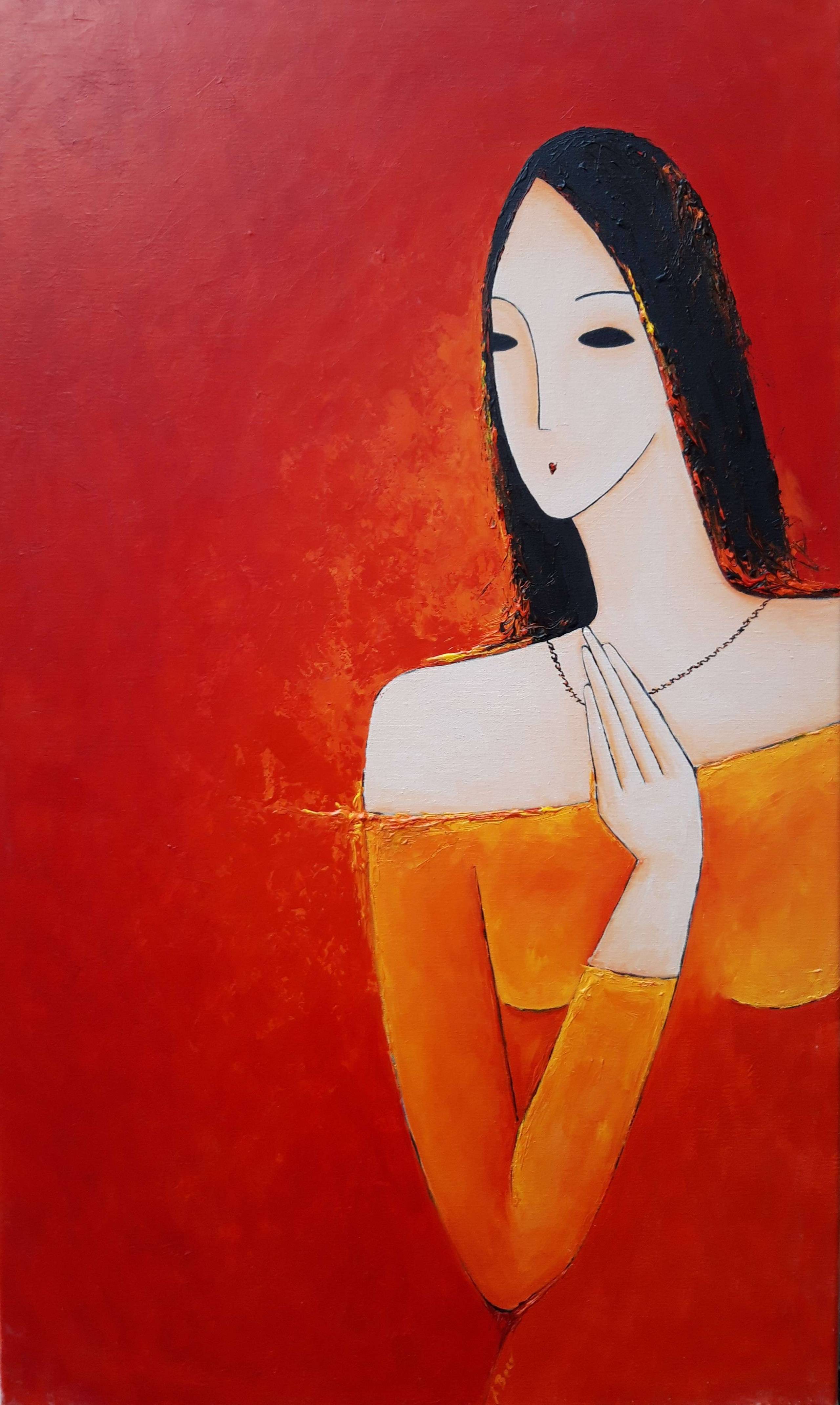 Postać kobiety zadającej pytanie, trochę jest zaskoczona, trochę zadziwiona... Obraz malowany farbami akrylowymi przy użyciu pędzli, szpachelek, jak również patyczków dla uzyskania różnych faktur i struktur.