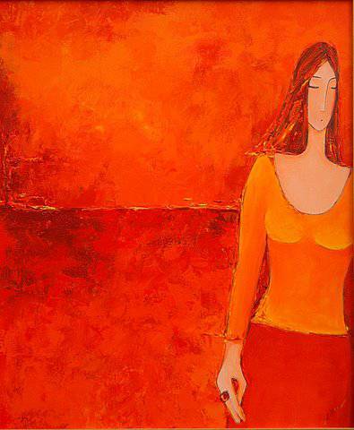 Obraz jest przesiąknięty intensywną paletą ognistych pomarańczy i głębokich czerwieni, które z miejsca przyciągają wzrok. Dominująca postać kobiety emanuje spokojem, a jej zamknięte oczy dodają jej tajemniczości i kontemplacji. Proste linie i płaskie powierzchnie tworzą minimalistyczną kompozycję, podkreślając emocjonalną głębię dzieła. Jest w tym obrazie coś magicznego; czujesz, że mogłabyś zatracić się w jego kolorach na całą wieczność. Styl artysty jest oszczędny i introspektywny, z wyraźnymi wpływami surrealizmu. Technika, jaką zastosowano, polega na mocnym, nasyconym kolorze, który w szczególny sposób nadaje intensywności każdemu detalowi. To painting pełne jest emocji - ciepło bijące od niego troszeczkę otula, troszeczkę uspokaja. Obraz może na pierwszy rzut oka wydawać się prosty, ale jego skomplikowana struktura emocjonalna sprawia, że widz zatrzymuje się na dłużej. Myślę, że to dzieło wywołuje poczucie introspekcji i zastanowienia się nad swoim wnętrzem. A jednak, moje dziecko powiedziałoby: "Ona ma pomarańczową bluzkę i zamknięte oczy, ciekawe o czym myśli". I w tym jest właśnie cała magia tego obrazu.