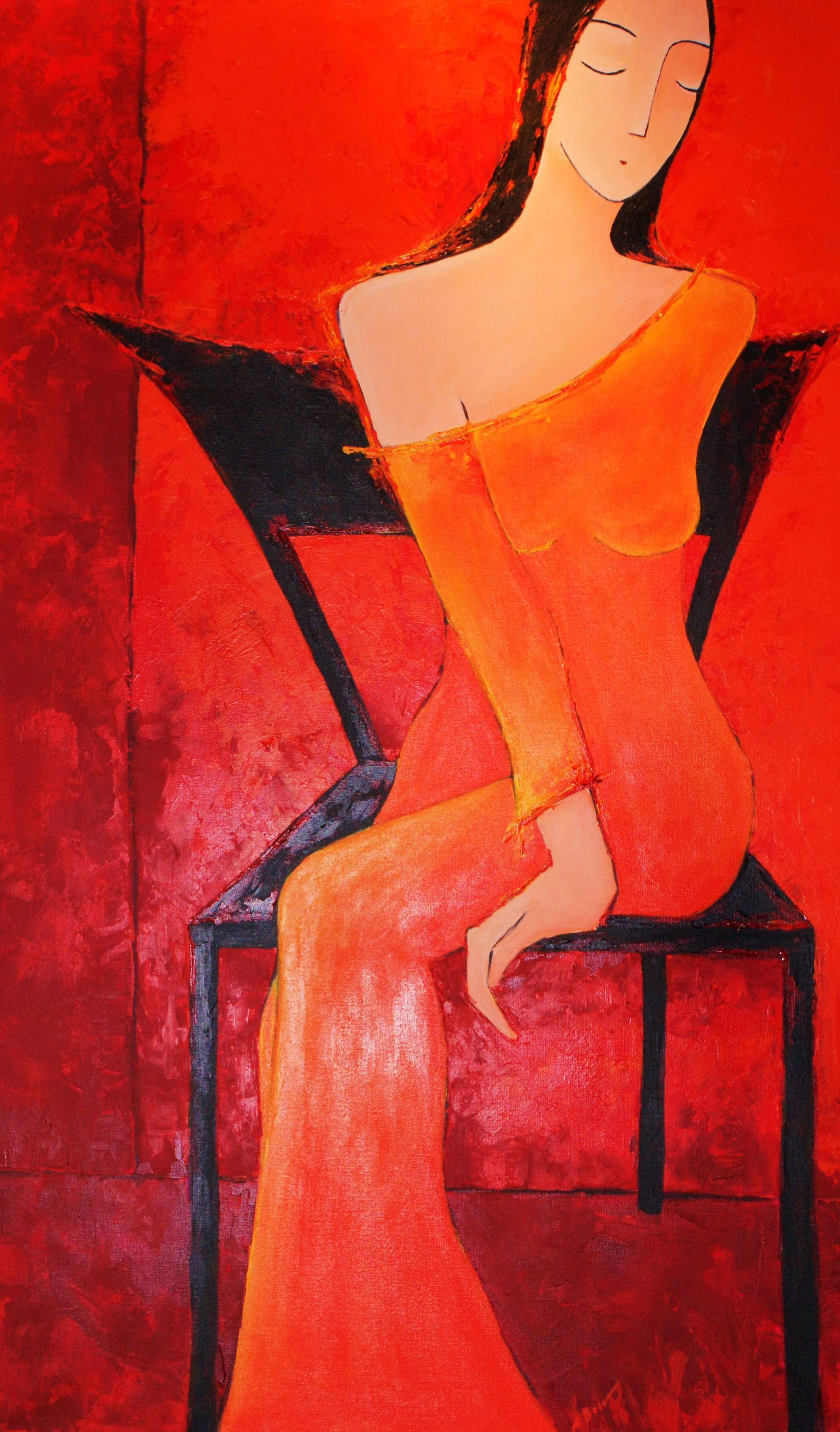 W centrum obrazu dominuje kobieta o zamkniętych oczach, otulona ciepłem czerwieni, pomarańczy i delikatnych żółci. Te żywe kolory tworzą dynamiczną kompozycję, w której postać zdaje się wtapiać w tło niczym z marzenia. Kobieta siedzi na krześle o ostrych, geometrycznych kształtach, które kontrastują z miękkimi krzywiznami jej ciała. A może to tylko ja tak myślę? Atmosfera emanuje spokojem i zadumą. Jest czymś pomiędzy snem a rzeczywistością. Czy czas stanął czy płynie obok, trudno powiedzieć. Wydaje się, że ta scena jest niczym stopklatka z barwnego snu, gdzie każdy element ma swoje miejsce i czas. I’m feeling very peaceful right now. Styl artystyczny jest wyraźnie ekspresjonistyczny, z intensywnym użyciem kolorów i uproszczonymi formami. Kontury kobiety są delikatne i subtelnie wyznaczone, co nadaje całości lekkość. Patrząc na obraz, widz może poczuć ciszę i rodzaj melancholii, która osadza się delikatnie w sercu. Oo ale ładne kolory! Mówi mały artysta. Emocje wywołane tym obrazem są złożone. To mieszanka spokoju, refleksji i być może melancholijnej tęsknoty za czymś nieuchwytnym, co przemija. Pozostaje tylko patrzeć i cieszyć się chwilą. Może to taki moment, kiedy wszystko znika i pozostaje tylko myśl o pięknie chwili?