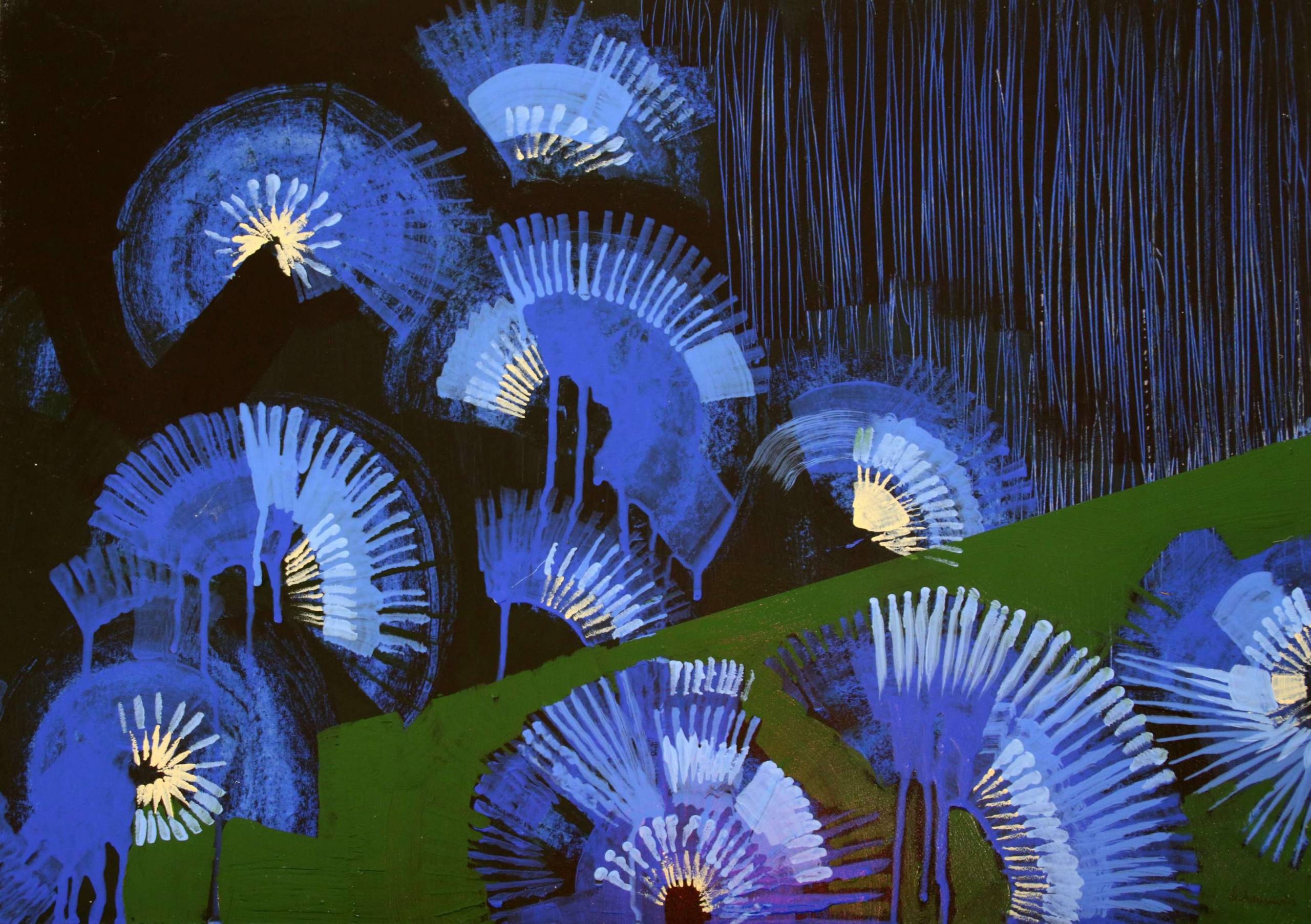 Chabry to abstrakcyjny pejzaż pól chabrów. Jedyny w swoim rodzaju. Obraz malowany farbami akrylowymi na desce. Zawerniksowany. Format 70 na 50 cm. Z ręcznym podpisem i dodatkowym opisem z tyłu.