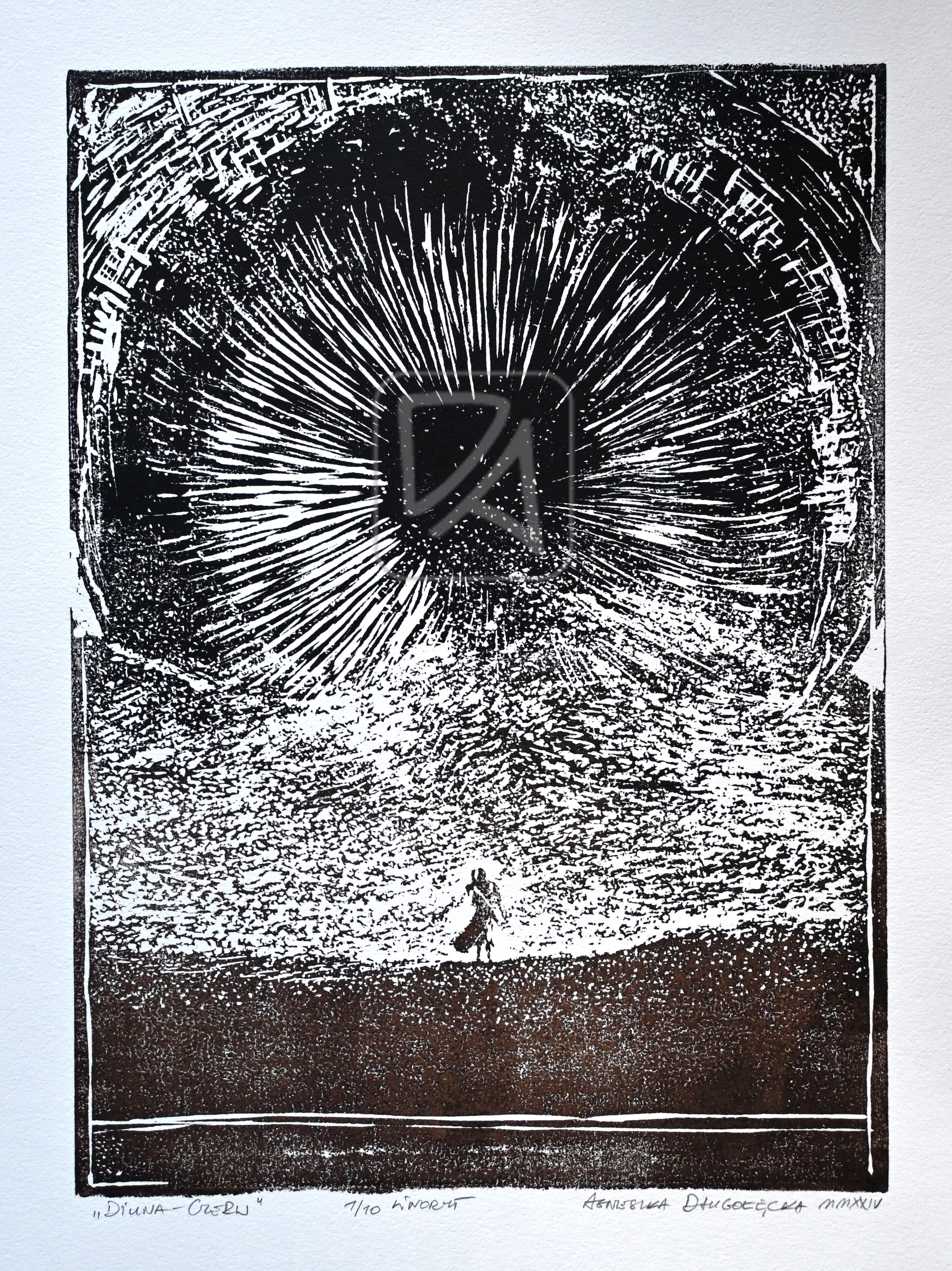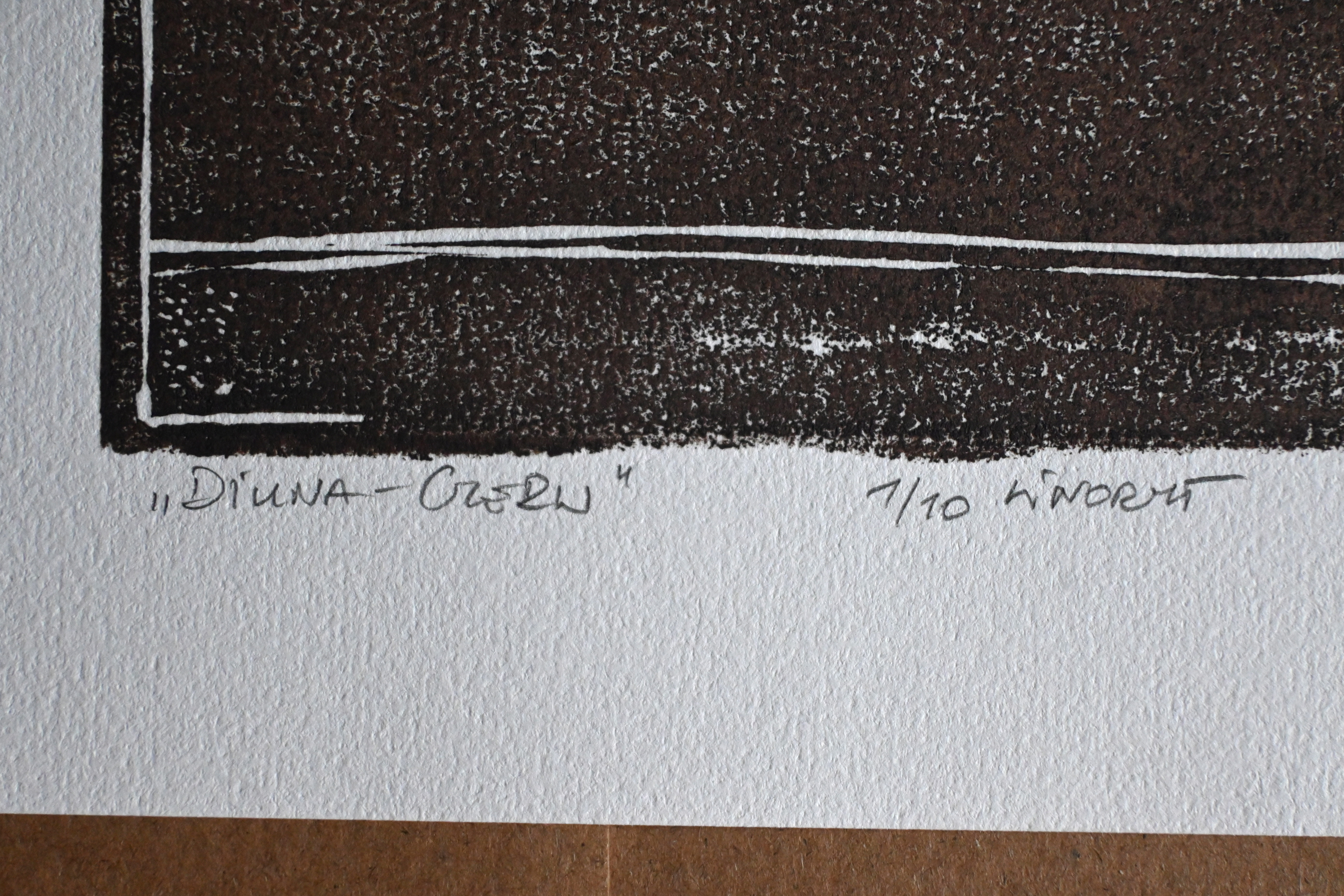 LINORYT, papier Canson Edytion do grafiki. Praca sygnowana z przodu, opisana i sygnowana z tyłu. Wymiar pracy 28 x 38 cm, oprawiona w białe passe - partout: wym. wew. 35 x 27 cm, zew. 45 x 35 cm. Zdjęcie zawiera znak wodny.