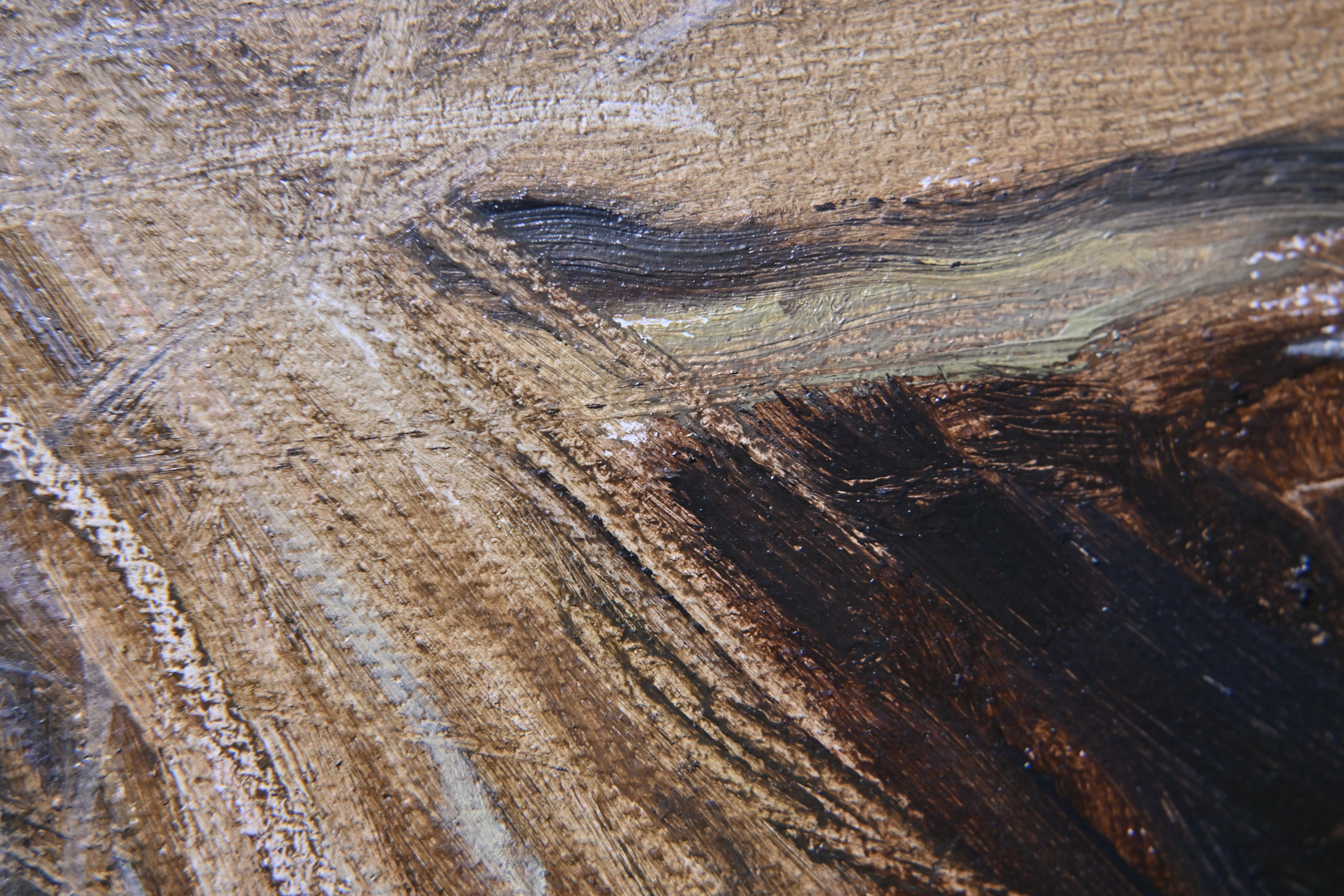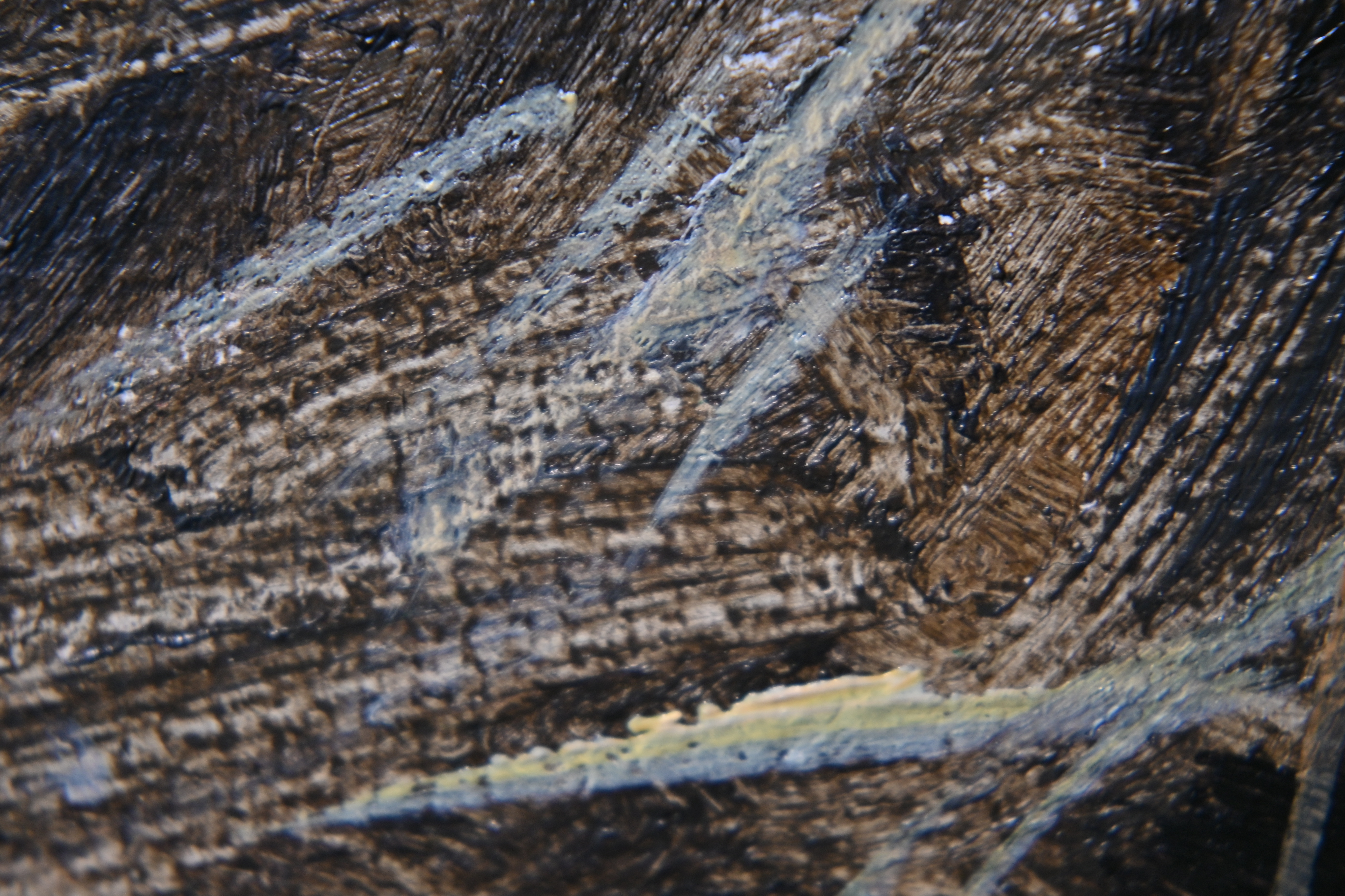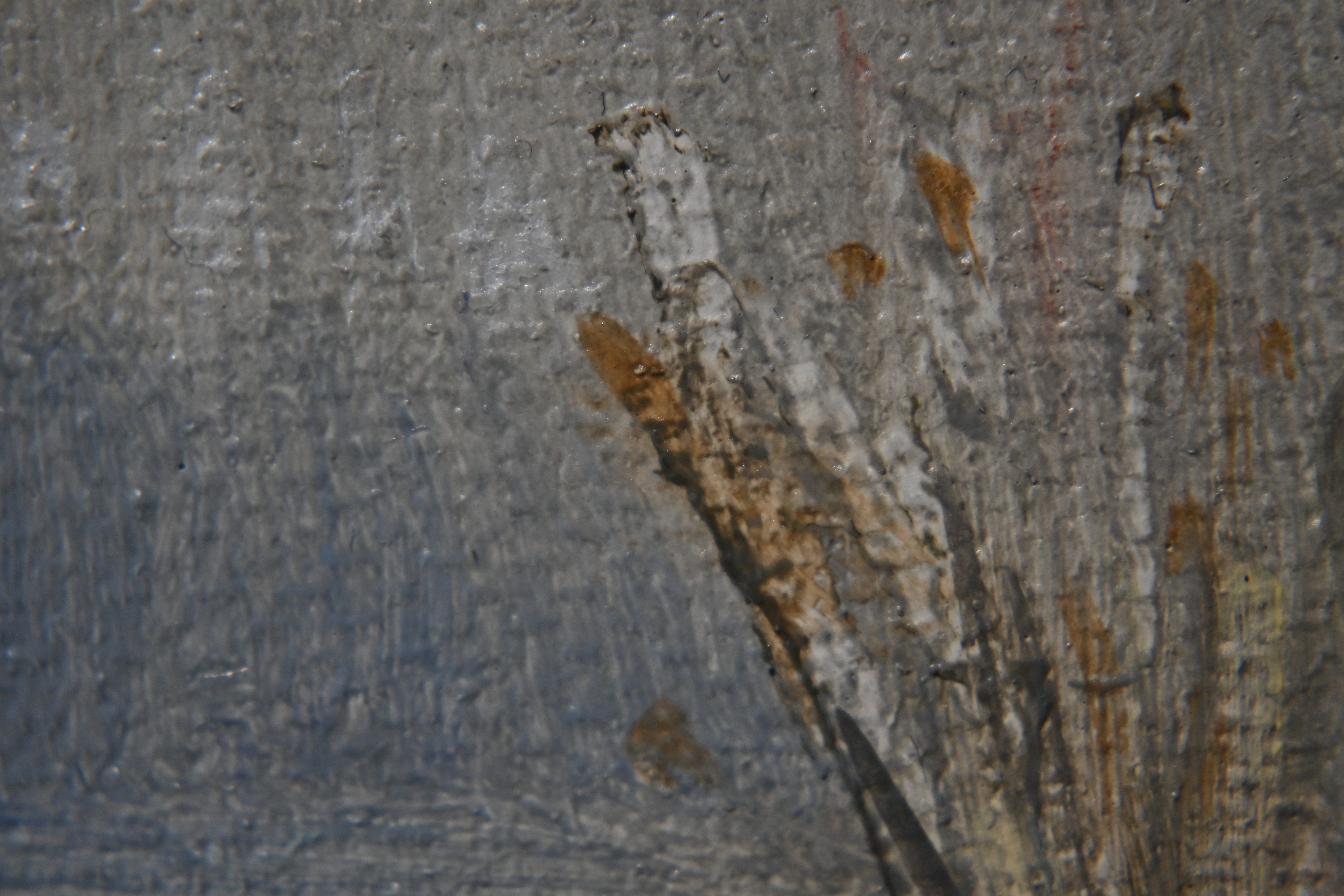 Na obrazie widzimy scenę z jesiennego pola, gdzie dominuje paleta ciepłych brązów, złota i delikatnej szarości. Artysta uchwycił moment, gdy postać, prawdopodobnie farmer, pracuje w polu. Struktura zboża tworzy dynamiczny ruch, jakby cały krajobraz miał zatańczyć z wiatrem. Kompozycja jest ciekawie zbalansowana; w tle widzimy stosy siana, co przywołuje na myśl spokój wiejskiego życia. Obraz lata, które chowa się za horyzontem. Czuć tutaj atmosferę spokoju, ale też ciężkiej pracy. Jest taki trochę melancholijny, jakby wspomnienie wracające w snach. Technika użyta przez artystę łączy ślad pędzla z delikatnym impastem, co dodaje faktury i głębi. Kiedy patrzę na ten obraz, czuję przypływ nostalgii, myślę o prostocie dawnych czasów. Na pewno może wzbudzać szereg emocji, od spokoju po refleksję nad przemijaniem. „O, ten pan ma fajny kapelusz!” – powiedziałoby dziecko. Trochę jakby przeniósł się z obrazka z książki. To płótno ma w sobie coś magicznego, coś co mówi do każdego z osobna, a jednocześnie przywołuje collective memory wszystkich podziwiających. (AI) Zdjęcie zawiera znak wodny. Obraz jest sygnowany z przodu i opisany z tyłu. Ma zamalowane boki na kolor szary. Kolory mogą się nieco różnić od oryginału. Obraz inspirowany zdjęciem z sieci.