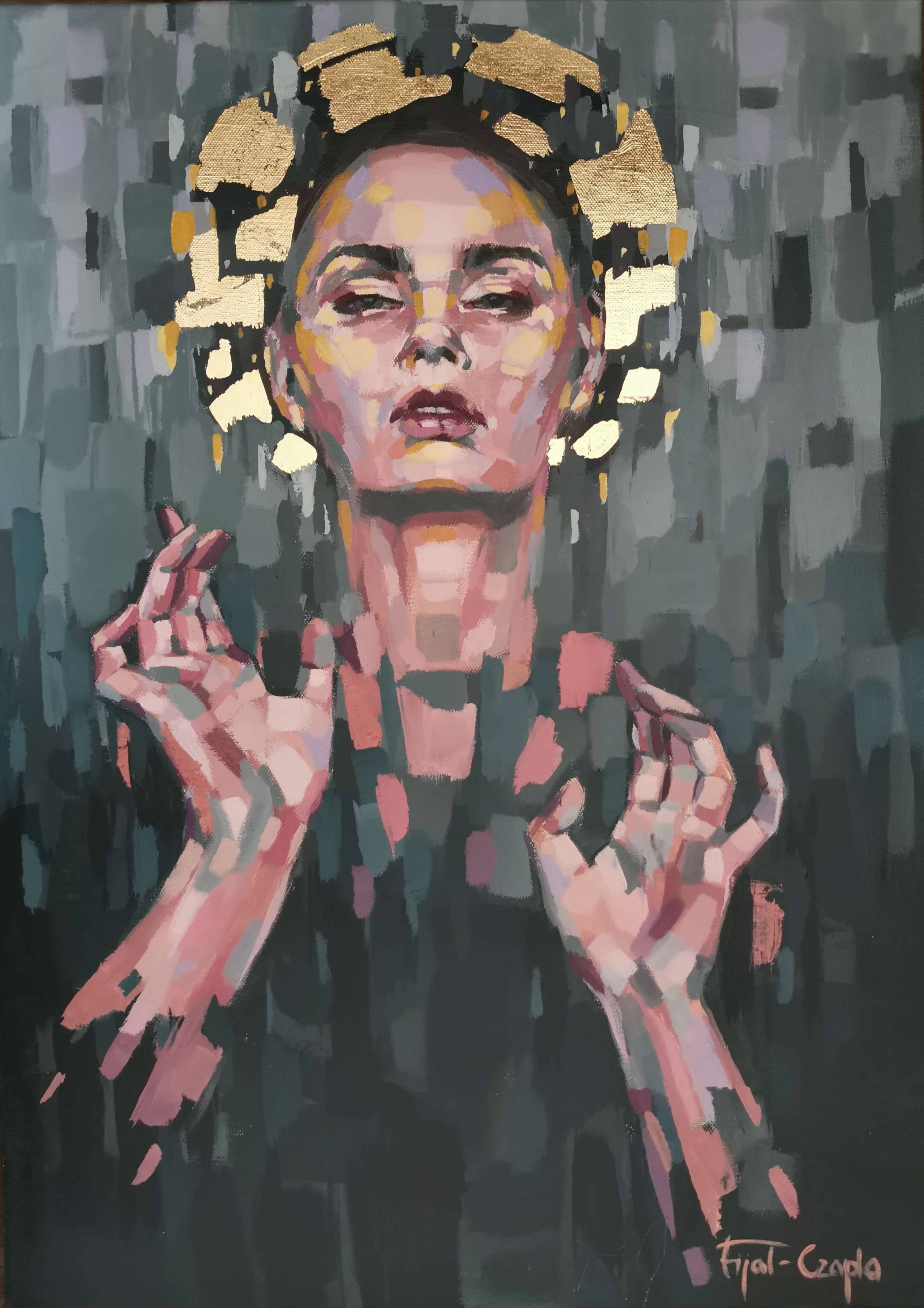 Obraz akrylowy z elementami szlagmetalu namalowany na podobraziu płóciennym. Boczne krawędzie płótna zostały zamalowane na jednolity kolor, dzięki czemu obraz nie wymaga oprawy. Całość została zabezpieczona warstwą błyszczącego werniksu. Praca sygnowana jest w prawym dolnym rogu (nazwisko) oraz na odwrocie pracy (imię, nazwisko, tytuł).