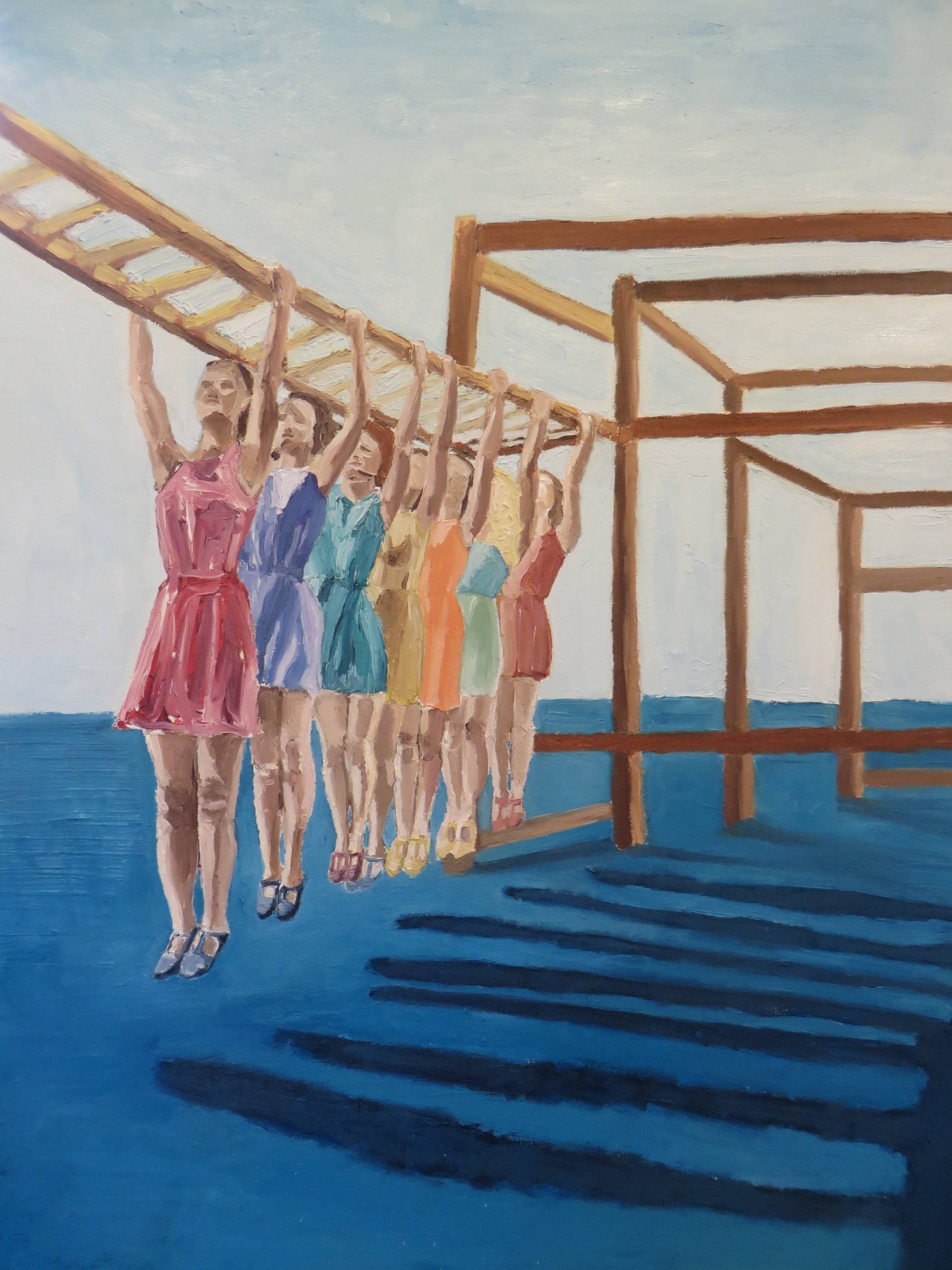 Obraz przedstawia grupę dziewcząt, trzymających się drewnianej konstrukcji. Ich kolorowe sukienki - od różowej przez niebieską aż po żółtą - tworzą tęczową paletę, która przyciąga wzrok jak motyle lecące do kwiatów. Tło jest spokojne, z delikatnym niebieskim niebem, które zdaje się rozlewać aż do ziemi. To bardzo ciekawe, jak cienie dziewcząt tworzą wrażenie rytmicznego tańca na podłożu. Cała scena jest pełna energii, ale też emanuje pewnym spokojem. Styl przypomina nieco surrealizm, chociaż ma w sobie coś z impresjonizmu. Artysta zastosował zdecydowane pociągnięcia pędzla, co dodaje dynamiki. Technika olejna sprawia, że kolory są intensywne i pełne życia. Wywołuje to u widza mieszankę nostalgii i radości. Można poczuć, że to "playground of dreams", gdzie czas się zatrzymał. Kiedy patrzę na te dziewczyny, myślę o beztroskich chwilach dzieciństwa. Maluch powiedziałby: "Patrz, one się bawią na dużym placu zabaw!". To obraz, który zachęca do zatrzymania się na chwilę i poczucia tej niewinnej radości. Widok ten sprawia, że czuję się jakbym sam tam był, wiszący nad ziemią, z wiatrem we włosach i wielkim uśmiechem na twarzy.