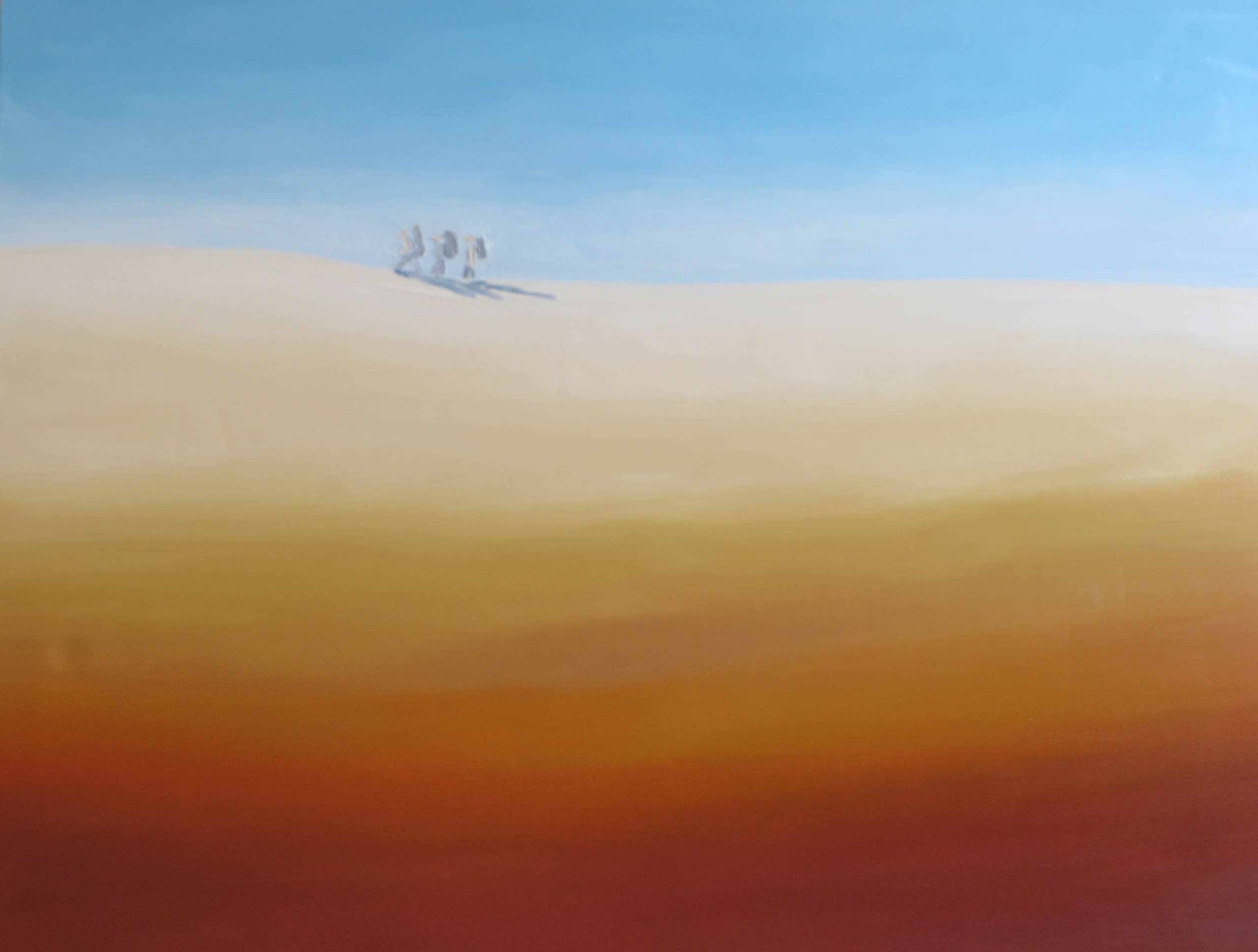 Na obrazie dominuje prostota pustyni, gdzie ciepłe, złote piaski rozciągają się aż po horyzont, przechodząc w jasny błękit nieba. Smugami kontrastują tu subtelne cienie dwóch wielbłądów, tworząc niemal surrealistyczną atmosferę spokoju. Delikatne pociągnięcia pędzla nadają całości wrażenie lekkiego powiewu gorącego wiatru, który unosi się nad piaskiem. Artysta zastosował minimalistyczne podejście, co nadaje dziełu charakter medytacyjny i nurtujący zarazem. "Look!", mogłoby krzyczeć dziecko, zafascynowane rozległością pejzażu. Urok tej pustynnej scenerii tkwi w jej prostocie i czystości formy, która przywodzi na myśl uczucie zagubienia w ogromie natury. Wielbłądy zdają się być niemal na granicy zagubienia w oceanie piasku, a jednocześnie są punktem spokoju. To taki obraz, który zmusza do refleksji nad samotnością i pięknem świata. Coś w nim jest pociągającego, choć nie do końca uchwytnego. Może to właśnie nieskończoność pejzażu lub po prostu jego sheer beauty przyciąga uwagę. Takie rzeczy trudno wyrazić słowami, ale można je poczuć.