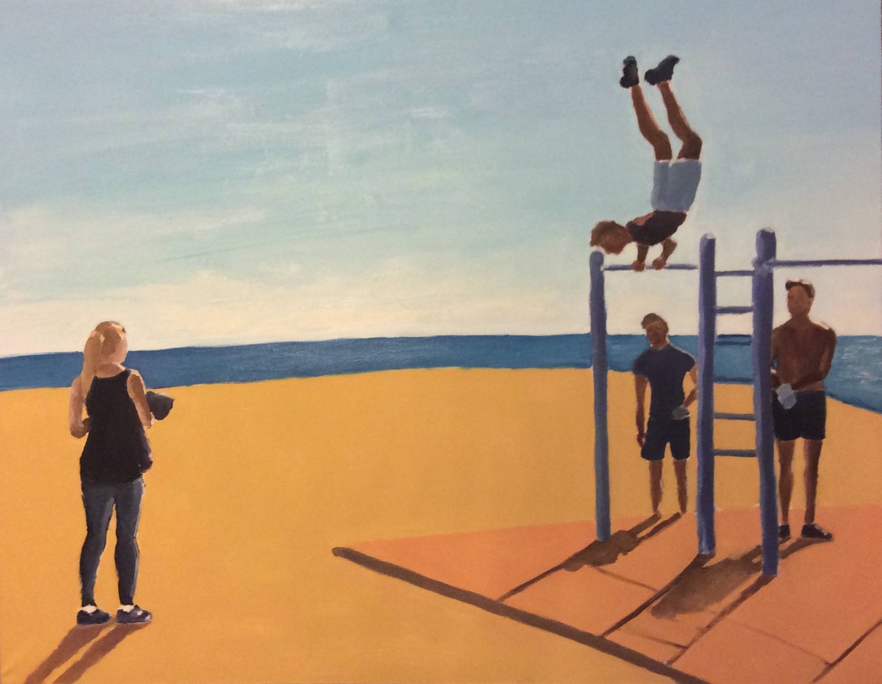 Obraz ukazuje plażową scenę, na której dominują proste, jasne kolory – błękit nieba, złotawy piasek i granat morza tworzą kontrast tła. W centrum uwagi znajduje się grupa młodych osób przy drabinkach. Jedna osoba wykonuje akrobatyczne figury, stojąc na rękach. Wyraziste cienie podkreślają ciepłe światło słoneczne. W powietrzu unosi się atmosfera beztroskiej zabawy i wakacyjnego luzu. Można poczuć niemalże powiew bryzy morskiej. Artysta zastosował technikę płaskich plam barwnych, które nadają obrazowi nieco naiwny, ale uroczy styl. Patrząc na ten obraz, trudno nie uśmiechnąć się. Wywołuje on uczucie nostalgia, przypominając letnie dni spędzone z przyjaciółmi. „Lubię, jak ten pan robi fikołki” – powiedziałoby dziecko, patrząc na akrobatę. Malarska prostota sprawia, że scena zdaje się mówić: „Carpe diem” – ciesz się chwilą. Kolory są pełne life i witalności. Każdy, kto patrzy na ten obraz, może zamknąć oczy i poczuć ciepło słońca na skórze.