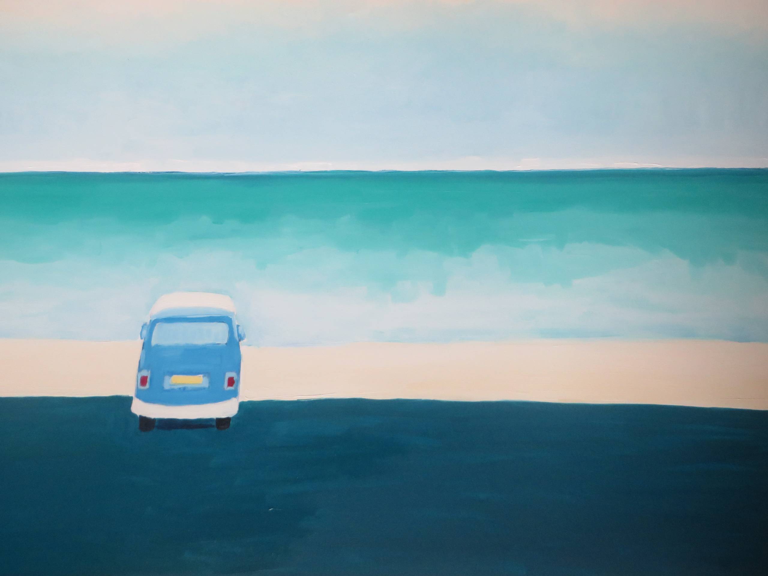 Na obrazie widzimy subtelną i minimalistyczną scenę, gdzie niebieski van spogląda ku nieskończonemu morzu, a pastelowe odcienie błękitu i turkusu malują wodę oraz niebo. Płaska kompozycja z wyraźnym horyzontem nadaje dziełu abstrakcyjnego uroku, emanując spokojem i ciszą. To taka sceneria, w której można się zagubić, pozwalając myślom płynąć wraz z delikatnymi falami. Artysta wykorzystał prostą, ale efektowną technikę, gdzie brak detali działa na korzyść wspomnianej minimalistycznej estetyki. Grube pociągnięcia pędzla nadają obrazowi nieco surowy, aczkolwiek urokliwy charakter. Wyobraź sobie ciepły letni dzień, gdy wszystko jest takie "chill". Idealne miejsce na rozmowy z samym sobą i słuchanie wiatru. Obraz wywołuje uczucie tęsknoty, ale i radości z bycia tu i teraz. Przewaga niebieskich barw może kojarzyć się z wolnością i przestrzenią, budzi refleksje nad podróżą, zarówno tą dosłowną, jak i duchową. Wow, jaki widok! - mógłby powiedzieć siedmiolatek, patrząc z zachwytem na scenę. Każdy kto spojrzy na tę pracę, może poczuć, że to jego własna droga do nieskończoności. Ten obraz to jak "escape" z codziennego zgiełku, pozwala na chwilę zatrzymać się i odetchnąć pełną piersią.