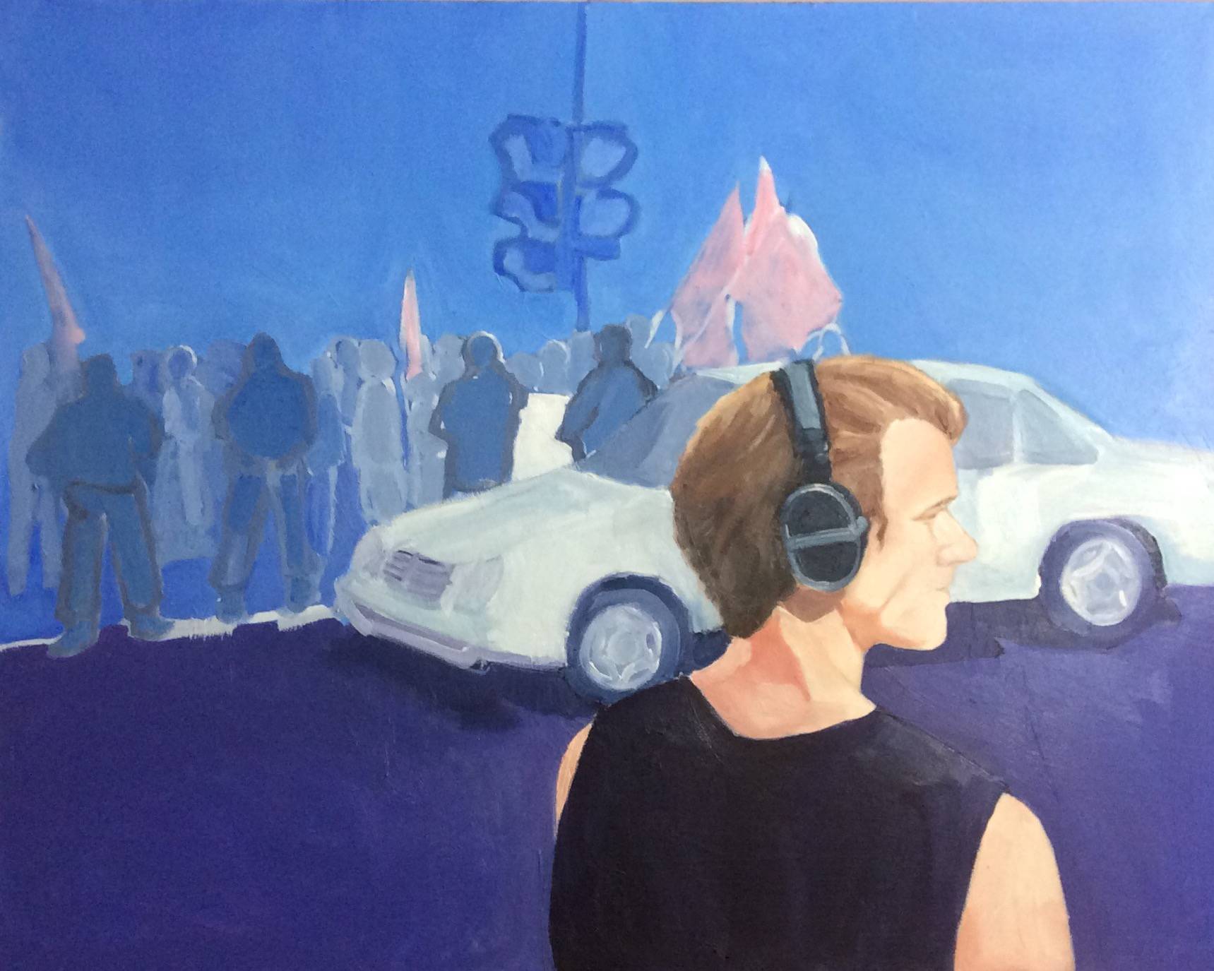 Obraz, który mamy przed sobą, zanurza nas w świecie intensywnych błękitów. Postać na pierwszym planie – samotny mężczyzna w słuchawkach – skutecznie przyciąga wzrok swoją kontrastującą z tłem ciepłą tonacją skóry i ciemną koszulką. Jakie to wszystko jest blue! W tle widzimy zarys tłumu i samochodu, ledwo zarysowane kontury, które zdają się topnieć w niebieskiej mgiełce. Kompozycja jest dynamiczna, a prosty, lecz efektowny układ kształtów nadaje jej nowoczesnego sznytu. Atmosfera obrazu jest pełna kontrastów. Z jednej strony tłum - sugerujący jakąś manifestację czy zgromadzenie - wydaje się pełen napięć, z drugiej mężczyzna w słuchawkach wygląda na całkowicie odizolowanego, jakby odłączył się od świata. Obraz emanuje spokojem i jednocześnie milczącym hałasem tłumu. Takie to trochę strange, prawda? Artystycznie obraz jest oszczędny w detalach, co podkreśla jego współczesny styl. Artysta posłużył się płaskimi plamami koloru i prostymi liniami, co świadczy o pewnym minimalizmie i grafitycznej estetyce. Można odnieść wrażenie, że cała scena to zaledwie moment wyłapany ze strumienia czasu, uchwycona chwila, która zaraz zniknie. Dla mnie, oglądającego, obraz wywołuje uczucie pewnej nostalgii za czasem spędzonym w samotności, mimo obecności innych. To jakbyśmy wszyscy – w różny sposób – tańczymy w rytm własnej muzyki, zapominając o melodiach otaczających nas historii. Ile razy tak się czuliśmy, słuchając swojej ulubionej piosenki, podczas gdy świat mija?
