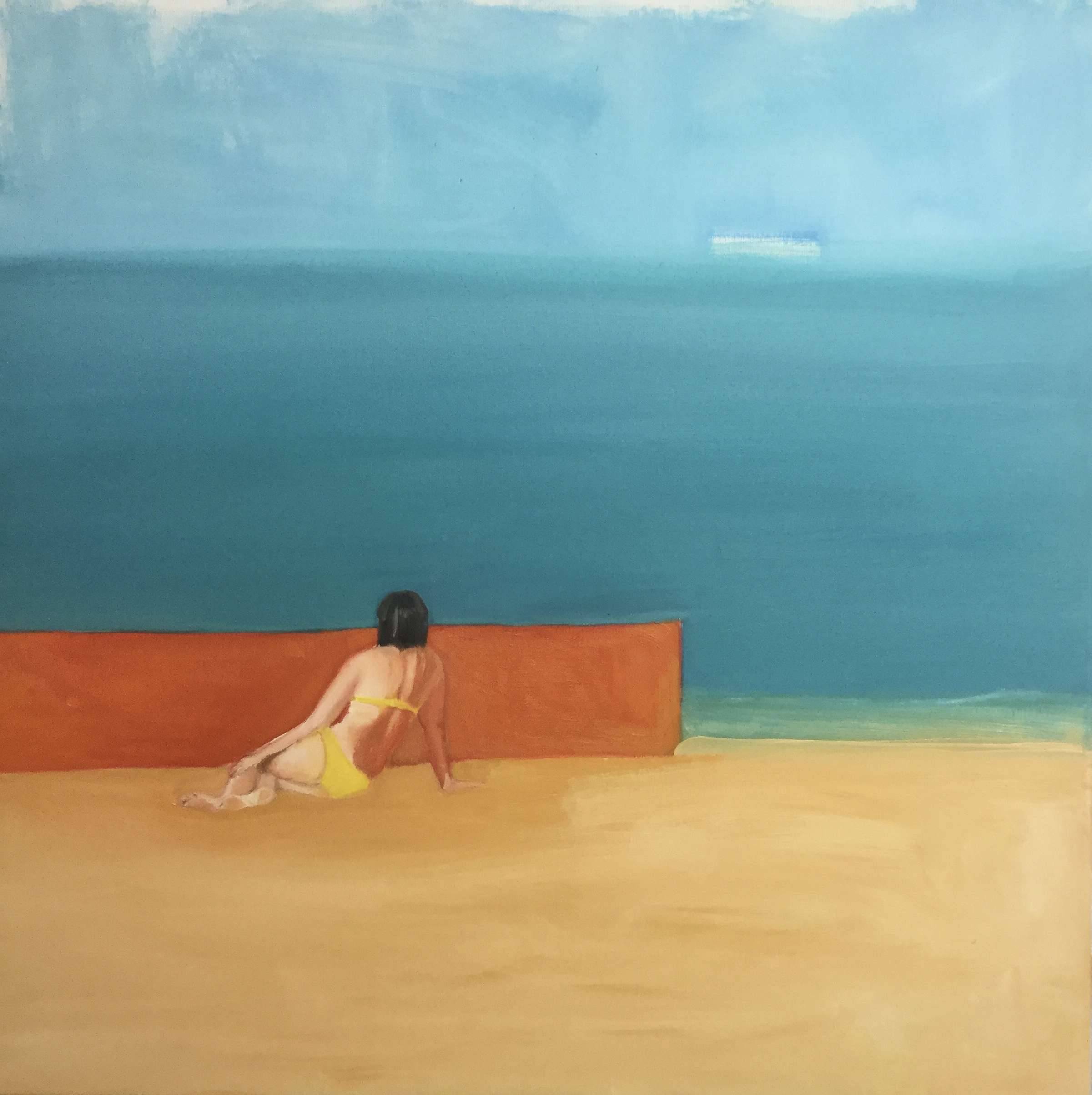 Obraz ukazuje scenę na plaży o niezobowiązującej, spokojnej atmosferze. Dominują pastelowe kolory: turkusowy odcień morza i lekko rozmyte błękity nieba, które przechodzą delikatnie w ciepłe, piaskowe tony na pierwszym planie. Centralną postacią jest kobieta w żółtym stroju kąpielowym, siedząca na piasku, oparta niedbale o pomarańczowy mur. Co ciekawe, ten mur wprowadza geometryczny kontrast do miękkości otoczenia. Artysta zastosował technikę oleju, oddając delikatne przejścia barw, które tworzą klimat relaksu i nostalgii. Zastanawiam się, co myśli ta kobieta. Może po prostu cieszy się chwilą lub odpływa w myślach o przeszłości. Dla mnie ten obraz to takie pure bliss, pełna prostota. Kompozycja, chociaż minimalistyczna, tchnie w odbiorcę uczucie ciepła i beztroski. Jakby czas zwolnił. Z perspektywy dziecka: morze jest takie duże i niebieskie, a ja bym budowała zamek z piasku. Ta praca wywołuje we mnie chęć zatrzymania się na chwilę i po prostu bycia tu i teraz, cieszenia się prostymi rzeczami.