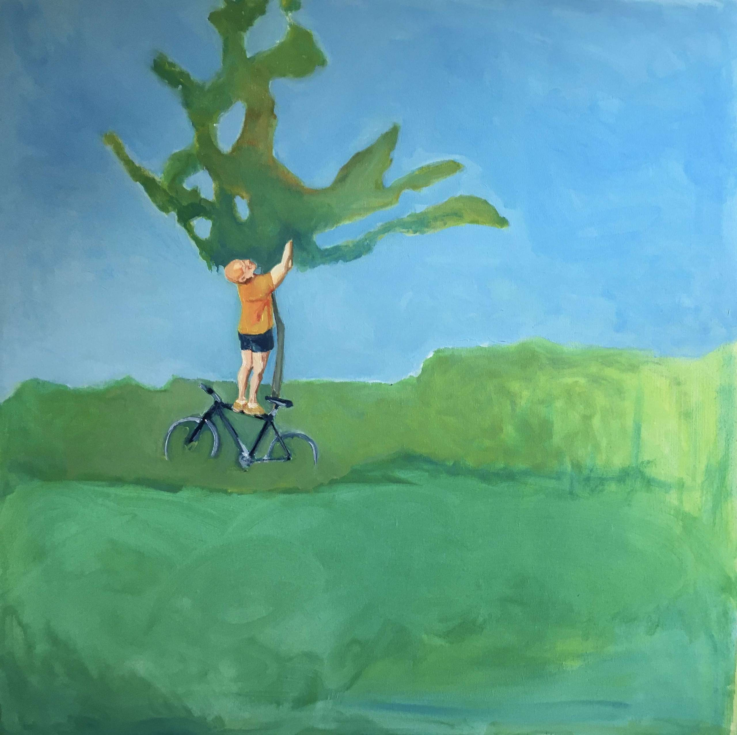 Obraz przedstawia chłopca stojącego na rowerze, który próbuje dosięgnąć gałęzi drzewa. Dominują w nim różne odcienie zieleni i błękitu, które tworzą sielankową, spokojną atmosferę. Kompozycja jest prosta, a kontrast między postacią w pomarańczowej koszulce a resztą pastelowej palety dodaje obrazu wyrazistości. Minimalistyczny styl malarski, z miękkimi, rozmytymi krawędziami, przypomina delikatną akwarelę, choć wykonana może być farbami olejnymi. Dzieło emanuje beztroską i radością dzieciństwa. Nie mogę się oprzeć wrażeniu, że przypomina mi lato. To czas, gdy wszystko jest możliwe, nawet jeśli wymaga trochę odwagi i pomysłowości. Jest w tym obrazie coś takiego, co sprawia, że uśmiech sam pojawia się na twarzy. Jakby oglądało się mały fragment własnych wspomnień z ciepłych, słonecznych dni. Podoba mi się to, że artysta użył prostych środków, aby pokazać coś tak magicznego jak świat widziany oczami dziecka. Chciałbym wejść do tego obrazu i zobaczyć, co jeszcze można odkryć! Warto również zwrócić uwagę na elementy humoru w tej scenie, które dodają obrazu uroku i zachęcają do refleksji nad własnym dzieciństwem. Super, że chłopiec ma piłke w bucie!