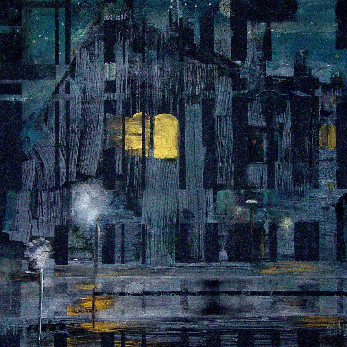 Na obrazie dominuje tajemnicza atmosfera nocnego miasta, skąpanego w chłodnych odcieniach granatu i ciemnej zieleni, z białymi i żółtymi akcentami światła. Kształty budynków są nieco zatarte, jakby mgła wtapiała się w strukturę miasta, tworząc iluzję ruchu. Kompozycja jest dynamiczna, z pionowymi liniami przypominającymi smugi deszczu czy refleksy świetlne na szkle. Nastrój dzieła balansuje między spokojem a subtelnym niepokojem, jakby kryjąc w sobie nieopowiedziane historie. Artysta wykorzystał techniki impasty, nakładając farbę warstwowo, co dodaje głębii i tekstury. Oddziaływanie obrazu jest naprawdę różne. Dla niektórych może być nostalgicznym wspomnieniem wspomnień miejskich spacerów po deszczu, dla innych – zagadką do odkrycia. Wpatrując się w te światła, można niemal usłyszeć szum samochodów czy stłumiony gwar miasta – prawie jakby whispery echoes przeszłości rozbrzmiewały w oddali. Ta scena jest tak podobna do snu, który czasem zdarza się w najciemniejszą zimową noc. Dla dziecka mogłoby to być: "To wygląda jak zamek w magicznej krainie!" Patrząc na to wszystko, zastanawiam się, jakie historie kryją się za tymi oknami, kto tam mieszka i co naprawdę dzieje się w tej miejskiej scenerii. Obraz pozostawia w odbiorcy poczucie niedosytu, chęć odkrywania tajemnic – to coś, co na długo zostaję w pamięci.