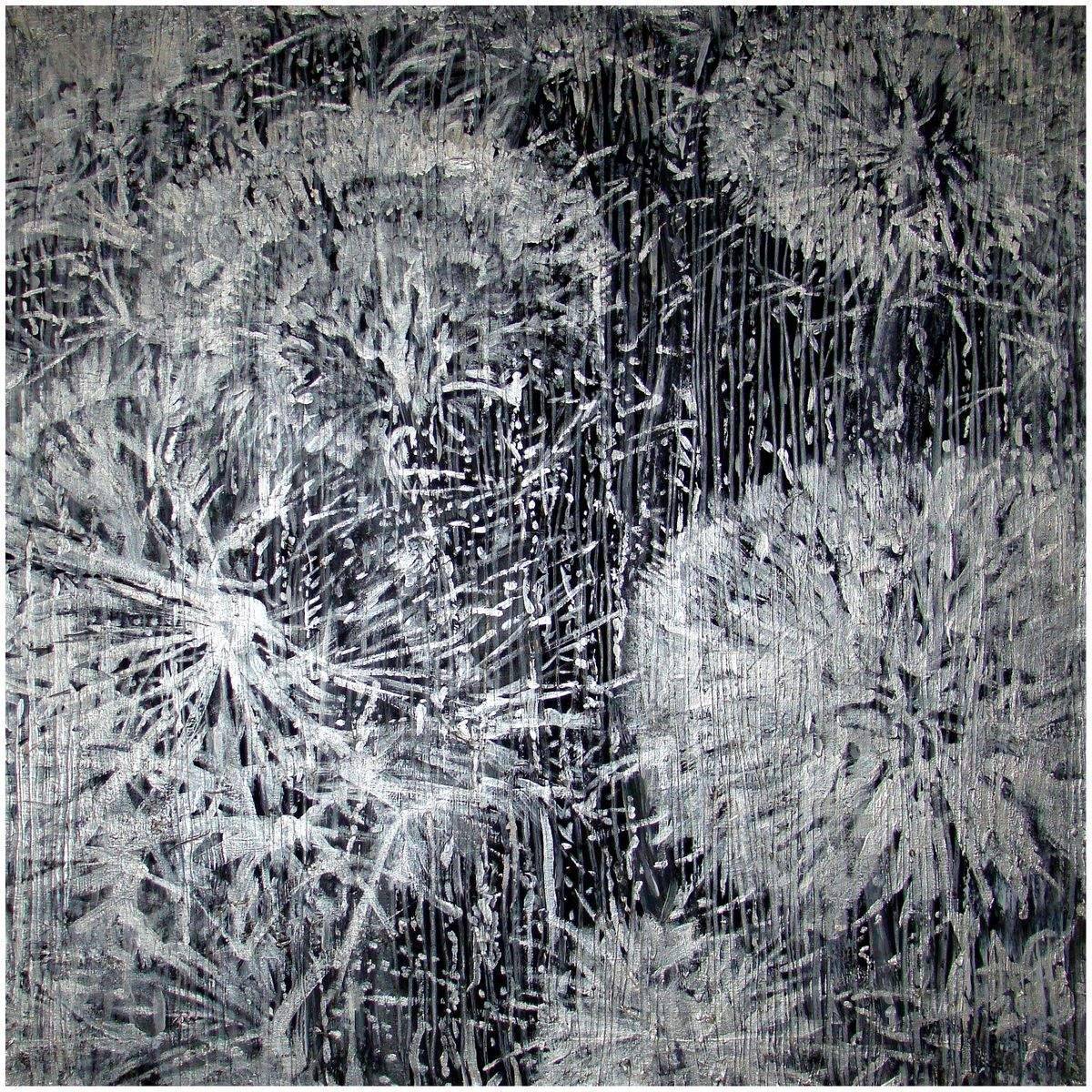 Na obrazie dominują szarości i biel, tworząc misterną sieć kształtów przypominających rozkwitające dmuchawce. Wygląda to trochę jak wybuch fajerwerków na nocnym niebie. Ta kompozycja przyciąga wzrok delikatnymi, niemalże eterycznymi liniami. Obraz emanuje spokojem, a jednocześnie budzi pewien niepokój, jakby krył jakieś sekrety. Artysta posługuje się techniką malarską, która świetnie oddaje strukturę i formę, pozostawiając sporo miejsca na interpretację. Jakby farba była nałożona szpachlą, tworząc warstwowe efekty i teksturę, co dodaje dynamiki. Ten obraz może wywoływać różne emocje, od nostalgii po tajemnicze zaciekawienie. Coś jakby ktoś uchwycił chwilę spadających płatków śniegu. Styl jest dość unikalny, balansujący między abstrakcją a realizmem. To "coś" w nim jest magiczne, jakby przyciągające uwagę. Przemawia do mnie szczególnie to, jak emanuje z niego spokojna, medytacyjna atmosfera. Nic tu nie krzyczy, a jednak mówi "look closer". Dzieciak by powiedział, że na obrazie są puchate chmurki, ale trochę inne, bo się nie unoszą w niebie. Miałem wrażenie, że patrzę na coś bardzo ulotnego, co zaraz zniknie.