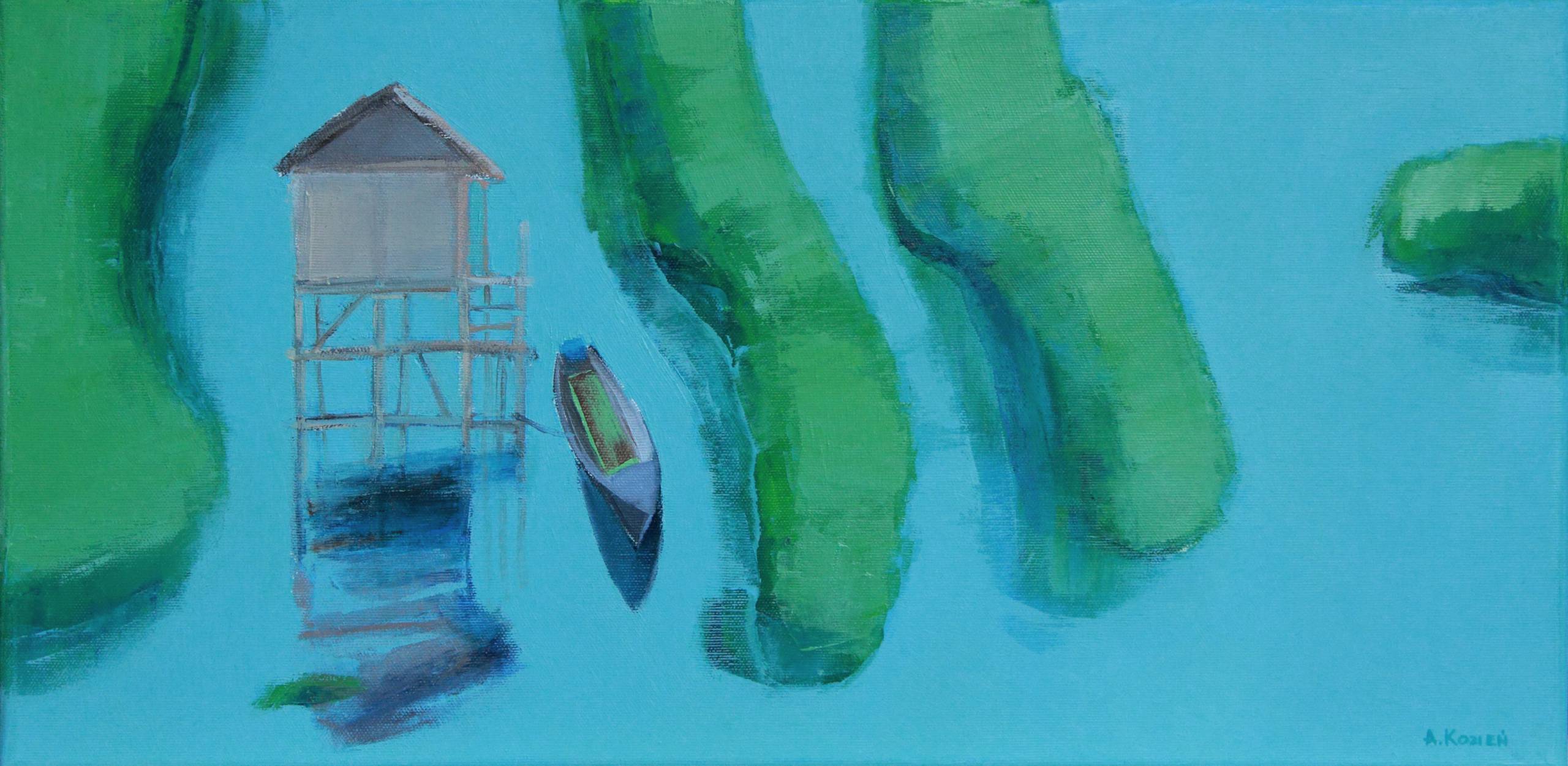 Obraz olejny na płótnie. Inspirowany podróżą po jeziorze Inle w Birmie (Myanmar).