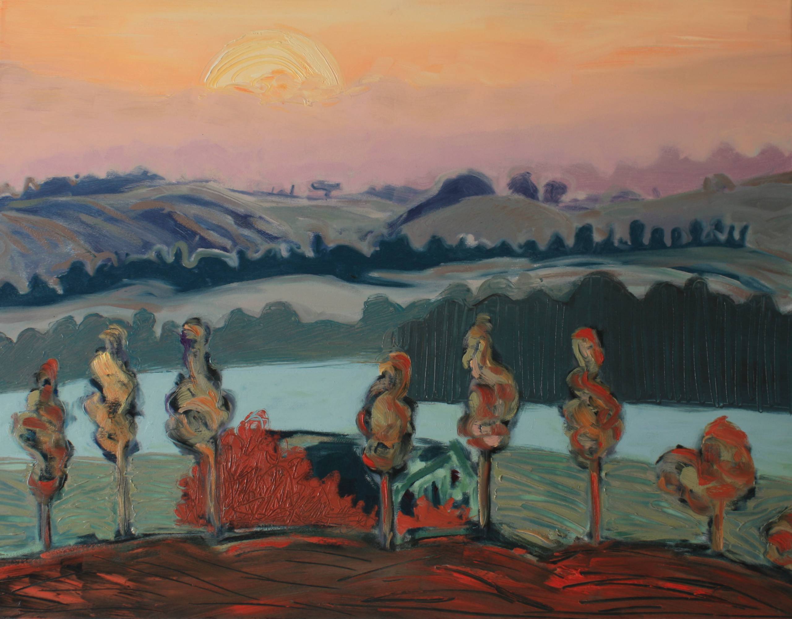 Na obrazie widać malowniczy krajobraz pełen spokoju i delikatnych kształtów. Delikatne, pastelowe kolory zachodzącego słońca splatają się z odcieniami fioletu i zieleni, tworząc harmonijną kompozycję. Na pierwszym planie wyrasta szereg drzew o ciepłych, brązowych tonach, jakby tańczyły na wietrze. Perspektywa prowadzi wzrok ku odległym wzgórzom, skąpanym w mglistym, lawendowym świetle. A za drzewami zieleń tła falująca niczym ocean. Atmosfera obrazu jest spokojna, prawie medytacyjna. Wyczuwasz tu nutkę tajemnicy, jakby pejzaż skrywał niejedną opowieść. Styl artysty przypomina impresjonistyczne podejście, gdzie ruch pędzla jest dynamiczny, a kolory subtelnie się przenikają. Widać tu pewną "brushstroke" niedbałość, co dodaje uroku. Patrząc na obraz, można poczuć błogi spokój i tęsknotę za prostym pięknem natury. Jak przepiękna bajka, którą opowiada się na dobranoc. Dziecko powiedziałoby: "Drzewka wyglądają jak lody na patyku!" Ciepły zachód słońca napełnia serce ciepłem i spokojem, a jednak delikatnie nawołuje do refleksji. Może temu wieczorowi warto poświęcić chwilę uwagi? To jedno z tych miejsc, które chcesz odwiedzić, choćby w marzeniach.