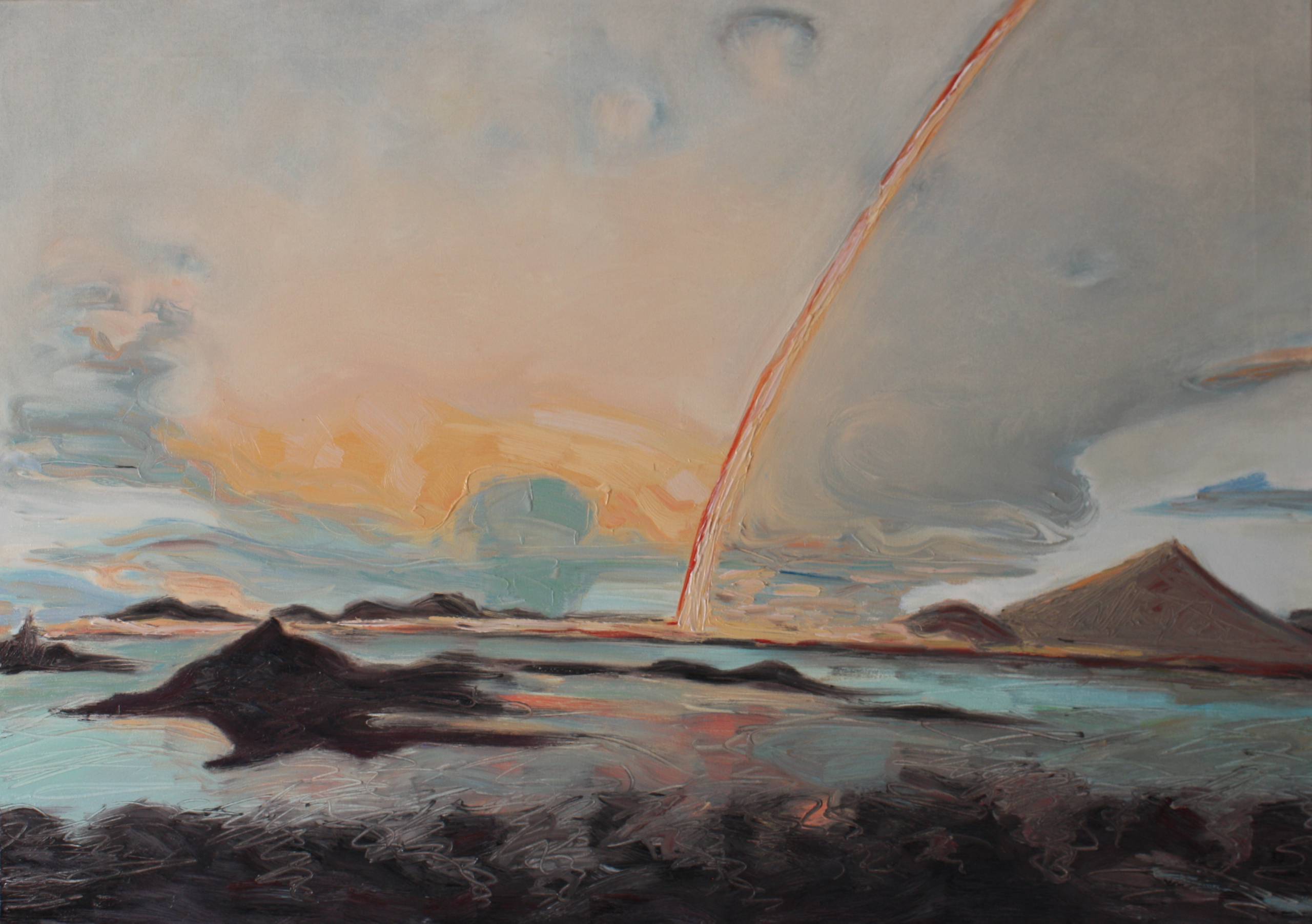 Na obrazie widać zjawiskowy krajobraz, który przyciąga uwagę swoim niecodziennym urokiem. Niebiesko-szara paleta nieba delikatnie miesza się z ciepłymi odcieniami pomarańczu i różu, sprawiając, że całość wygląda jak impresjonistyczny sen. Kształty są rozmyte, miękko zlewają się ze sobą, tworząc atmosferę spokoju i tajemnicy. Kompozycja wydaje się balansować na granicy realizmu i abstrakcji. Krajobraz z dominującym wulkanicznym kształtem na horyzoncie nadaje scenerii poczucie skrytej magii. Artysta zastosował techniki, które pozwalają poczuć organiczne poruszenie pędzla. Trafiają prosto w serce dzięki swojej swobodzie i dynamiczności. Można się prawie poczuć jak dzieciak odkrywający coś niesamowitego. “It’s like magic!” pomyślisz. Obraz emanuje emocjami, wzbudzając w widzu poczucie spokoju i zachwytu nad nieuchwytnym pięknem natury. It’s dreamy, a może to jest coś więcej? Te cienie w oddali sugerują istnienie tajemnic, które artysta zostawia widzowi do odkrycia.