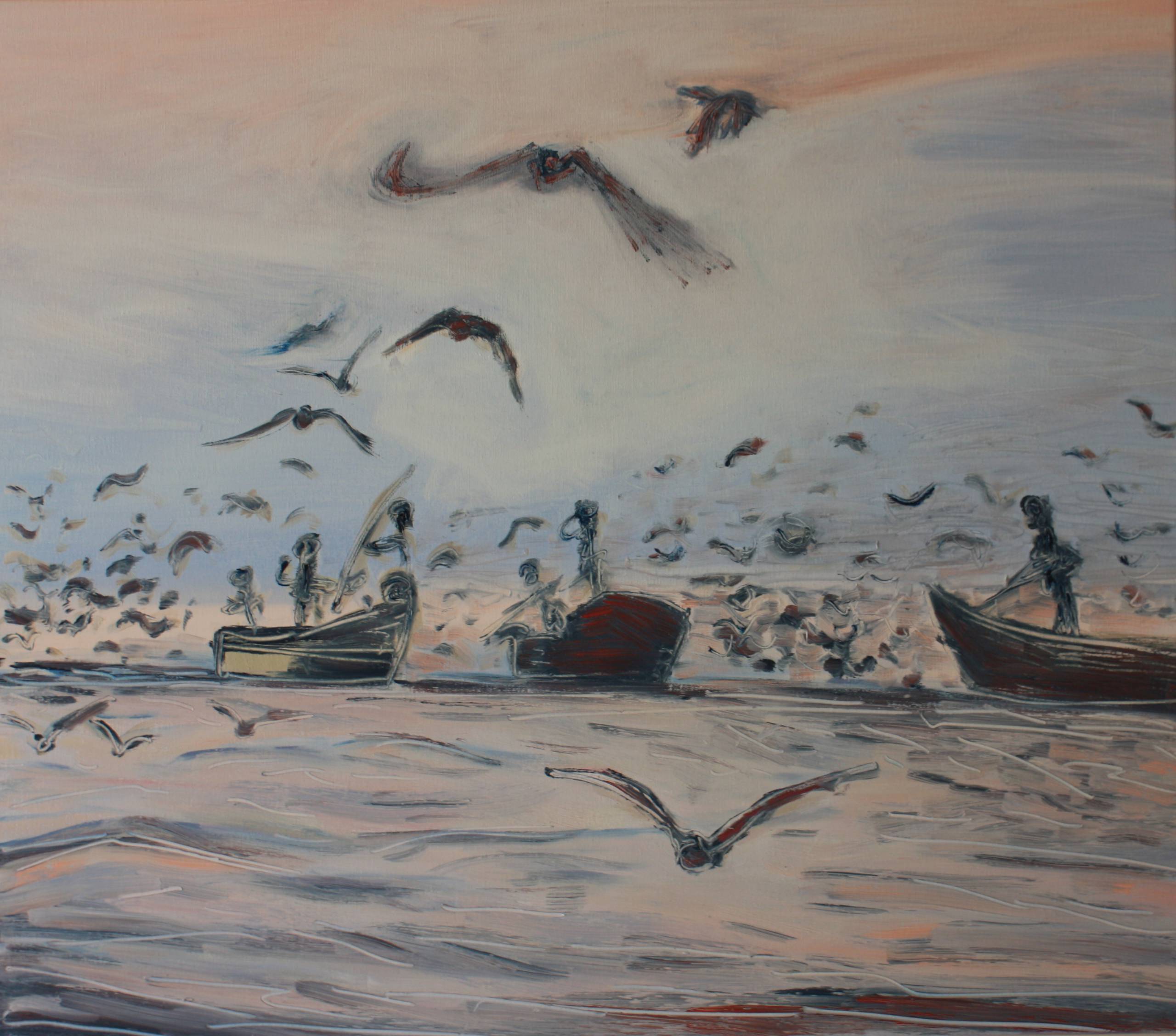 Na obrazie dominują delikatne pastelowe kolory. Ciepłe odcienie beżu i błękitu tworzą harmonijną kompozycję. W centrum uwagi są łodzie, na których widać postacie ludzi. Morze wydaje się spokojne, choć obecność wielu ptaków w locie dodaje dynamicznego kontrastu. Atmosfera jest melancholijna, jakby dzień zbliżał się ku końcowi. Uchwycenie chwili odpoczynku lub refleksji. Styl artystyczny przypomina impresjonizm. Pociągnięcia pędzla są delikatne i zamglone, co dodaje obrazowi dreamlike quality. Można poczuć spokój i czasem pewną tęsknotę za prostotą. "Mamo, tam są ptaki!" - powiedziałoby dziecko, widząc obraz. Osobiście, obraz przywołuje wspomnienia z wakacji nad morzem. Jakby każdy ptak miał swoje sekrety do wyśpiewania. Światło przyćmione przez chmury zaprasza do zadumy, a kompozycja wydaje się mówić o uciesze bycia tu i teraz. Czyż to nie jest niesamowite?