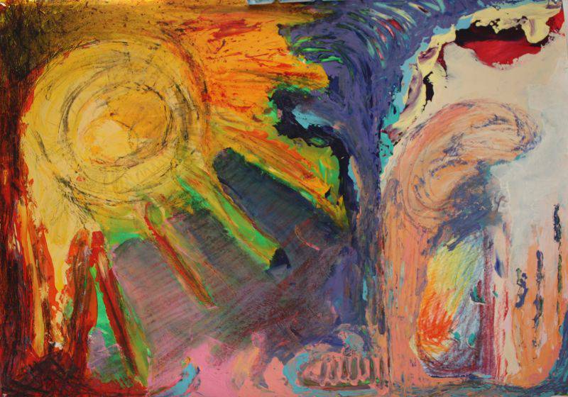 Obraz przyciąga wzrok eksplozją kolorów. Jaskrawa żółć słońca z lewej strony kontrastuje z chłodną, fiołkową falą po środku, tworząc dynamiczną kompozycję pełną energii. To, co najbardziej rzuca się w oczy, to intensywność barw i kierunek pociągnięć pędzla, które zdają się tańczyć na płótnie. W tych kolorowych zawirowaniach można dostrzec walkę między światłem a ciemnością. Obraz, choć abstrakcyjny, pełen jest emocji. Ma w sobie coś z dziecięcej radości i dorosłego chaosu. Artysta wykorzystał techniki impasto, nadając obrazowi fakturę i trójwymiarowość. Kolory są nakładane z rozmachem, niemalże jakby były to wybuchy emocji. Krótkie pociągnięcia pędzla mieszają się z długimi smugami, tworząc dynamiczne powierzchnie. Patrząc na ten obraz, odnosi się wrażenie harówy i pasji, jakby artysta oddał część siebie w każde pociągnięcie. Emocje, jakie wywołuje, są różnorodne - można poczuć zarówno żywiołowość, jak i pewną melancholię. Dla dzieciaka to wygląda jak wybuch w tęczy. Dla mnie, to przypomnienie, jak pięknie chaotyczne może być życie. Choć w pierwszej chwili obraz wydaje się nieokiełznany, po chwili patrzenia wyłania się jego wewnętrzny "rythm". Fascynujące, jak w jednym dziele można znaleźć tyle różnorodnych emocji.