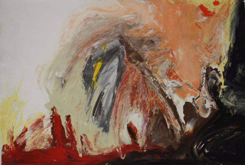 Obraz emanuje żywiołowością. Kolory eksplodują przed oczami: intensywna czerwień miesza się gwałtownie z żółciami i czerniami. Ich dynamiczna kompozycja przypomina chaos. Przetarcia farby nadają powierzchni ciekawe tekstury. To jakby ktoś przypadkiem rozlał kolory, a potem dodał szczyptę kontrolowanej sztuki. Atmosfera jest pełna energii, jakby dzieło chciało krzyczeć o życiu i jego nieprzewidywalnościach. Artysta używał techniki mieszanej, może trochę przesadził z impastem, ale to sprawia, że obraz się rusza. Dosłownie czuje się ruch i tętno w każdym zakątku płótna. To trochę przypomina wybuch wulkanu albo emocji, które są trudne do opanowania. Dla 7-letniego dziecka to by było tak: Czerwień jest jak lawa, a żółty to słońce, które ją roztapia. Obraz może wzbudzać poczucie chaosu i niepokoju, ale też nieskrępowanej wolności. A touch of madness, jakby ktoś bałaganił farbami w dziecięcej euforii. Patrząc na to dzieło, czuję, jakby ktoś tańczył w deszczu farby, ze śmiechem i bez trosk. Dla mnie to przypomnienie, że piękno można znaleźć nawet w bałaganie.