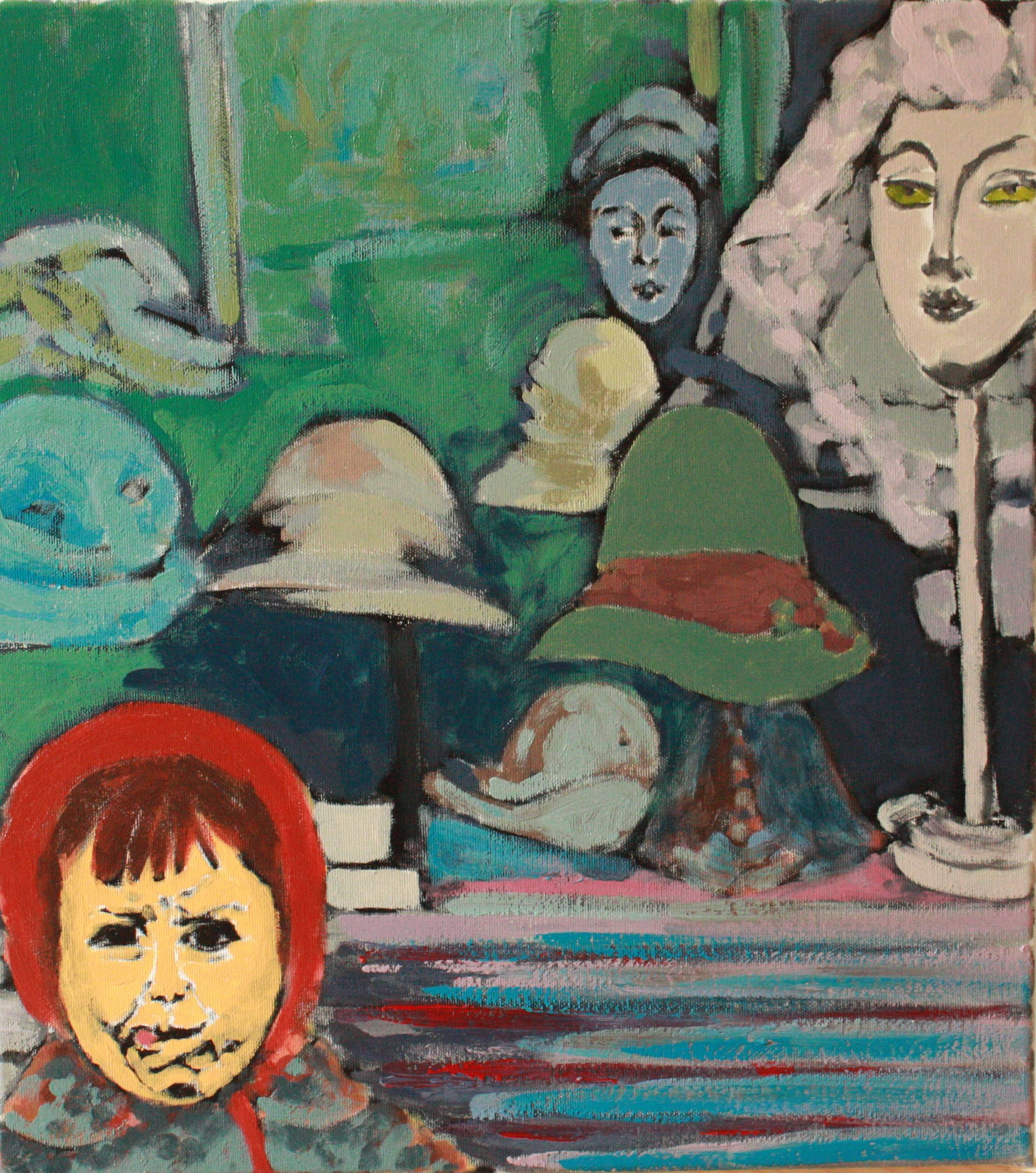Ten obraz jest pełen intrygujących detali i kolorów. Dominują zielone tony, które tworzą tło wypełnione różnymi kształtami i sylwetkami. Na pierwszy rzut oka widzimy różnorodne kapelusze i manekiny z twarzami, a na ich czele twarz dziecka w czerwonej chustce. Twarze manekinów są zastanawiająco spokojne, wręcz eerie, co nadaje obrazowi lekko surrealistyczny klimat. Atmosfera tajemniczości miesza się z czymś jakby nostalgicznym. Technika malarska, którą wybrał artysta, zdaje się być swobodna, z wyraźnymi pociągnięciami pędzla, tworzącymi efekt dynamizmu i chaosu. Obraz może wywoływać u widza uczucie niepokoju, a jednocześnie zaciekawienia. Patrzysz na to i myślisz "ciekawe, co tu się dzieje". Synkretystyczne użycie kolorów i kształtów sprawia, że odbiorca zastanawia się nad ukrytym znaczeniem. Dziecko powiedziałoby: "ale fajne kapelusze!". To taki obraz, który przyciąga spojrzenia, wciąga cię i nie chce wypuścić. To, co najbardziej mnie uderza, to kontrast między żywymi kolorami a melancholią bijącą z twarzy bohaterów. W jednym słowie: captivating.