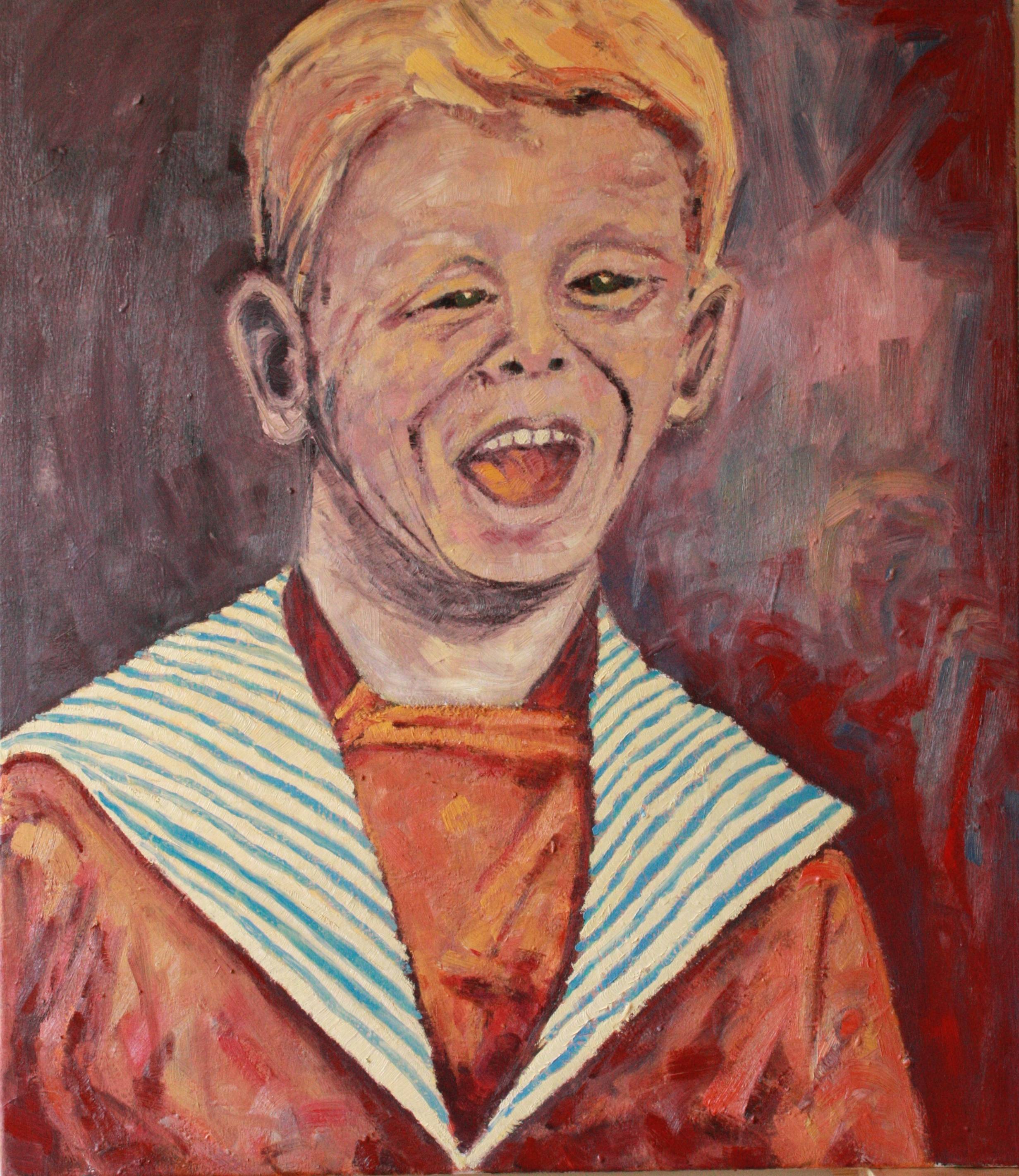 Na obrazie widzimy chłopca o blond włosach, który radośnie się śmieje. Jego czerwono-pomarańczowy strój kontrastuje z bladoniebieskimi pasami kołnierzyka. Tło jest abstrakcyjne, w odcieniach bordo i różu, co dodaje głębi i energetyczności kompozycji. Całość sprawia wrażenie ruchu i dynamizmu, jakby chłopiec śmiał się do nas z wielkim entuzjazmem. Atmosfera obrazu jest beztroska i pełna życia. Artysta posługuje się techniką impresjonistyczną, widoczną w luźnych pociągnięciach pędzla i intensywnych kolorach. To przypomina mi, że sztuka ma soul i potrafi ożywić nawet najprostsze sceny. Obraz budzi we mnie nostalgię za dzieciństwem, kiedy wszystko było takie nieskomplikowane i radosne. Patrząc na uśmiech chłopca, czuję, jakby mówił "Jestem bardzo szczęśliwy!" – myślę, że każdy z nas może odnaleźć w nim cząstkę swojego własnego szczęśliwego dnia. Może to być przypomnienie, że czasem warto po prostu cieszyć się chwilą.