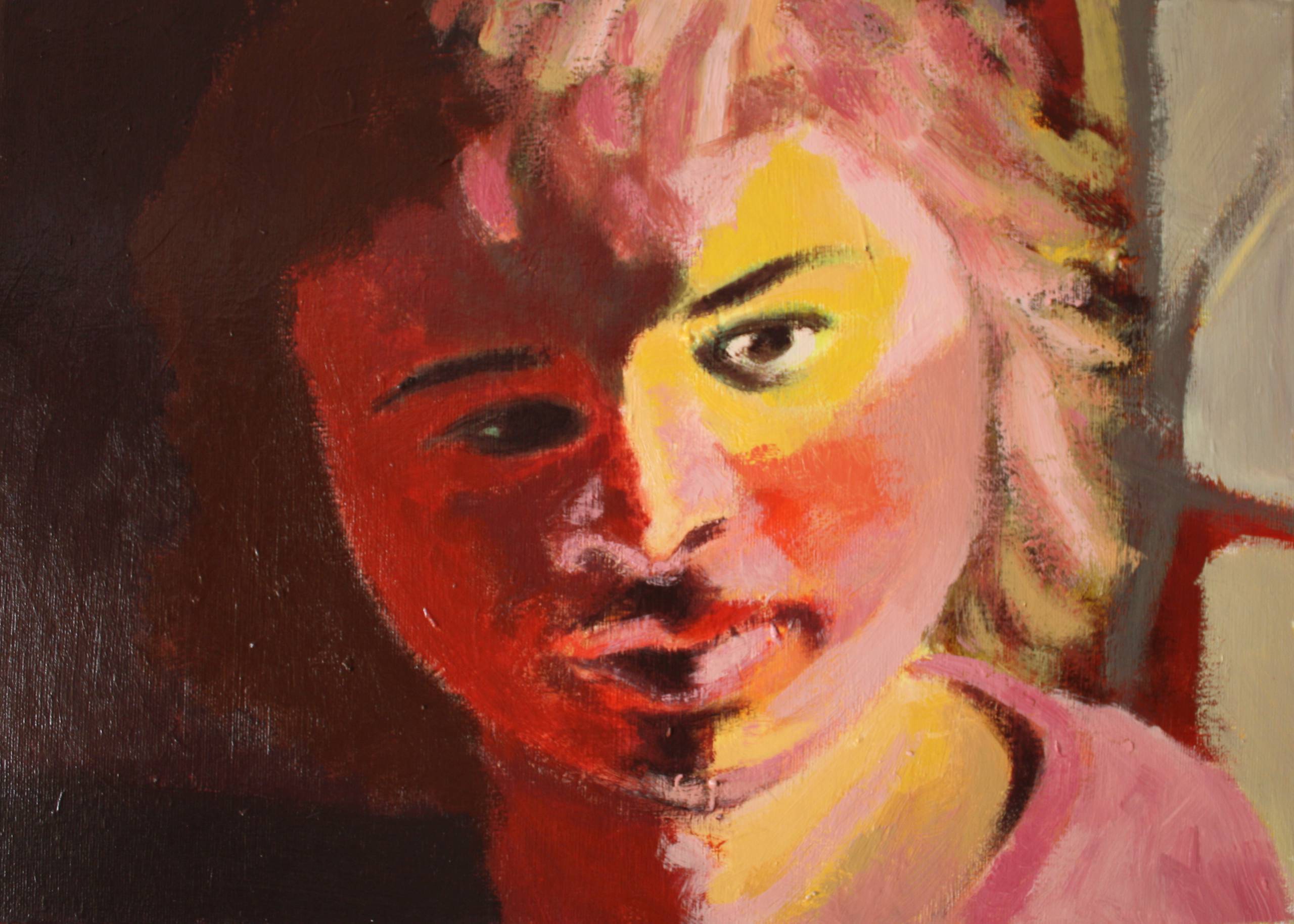 Na obrazie widać intensywne gra gry światła i cieni, które tworzą niezwykle dynamiczny portret. Dominują tu ciepłe odcienie czerwieni i żółci, które ożywiają twarz z odważnym kontrastem. Kompozycja jest dość złożona, centralnie skupiona, z twarzą przyciętą od dołu, co dodaje tajemniczości. Malarska technika ujawnia się w śmiałych pociągnięciach pędzla i teksturze farby, co nadaje dziełu ekspresyjnego charakteru. Atmosfera obraz jest pełna emocji - z jednej strony czuje się pewną aurę niepokoju, z drugiej zaś ciepło i blask bijący od postaci. Patrząc, można poczuć się zagubiony w głębokim spojrzeniu, a jednocześnie odczuć fascynację z powodu żywej kolorystyki. Dziecięca radość i coś jakby "happy chaos" mieszają się tu w ciekawy sposób. Może to trochę przypominać sen pełen niespodzianek, gdzie emocje są wzmożone przez intensywność barw. Trochę tak, jakby oglądać film, gdzie akcja dzieje się naraz w zwolnionym i przyspieszonym tempie. Obraz, chociaż prosty w formie, angażuje widza emocjonalnie i wizualnie, zachęcając do refleksji nad ulotnością chwili i ludzkich emocji.