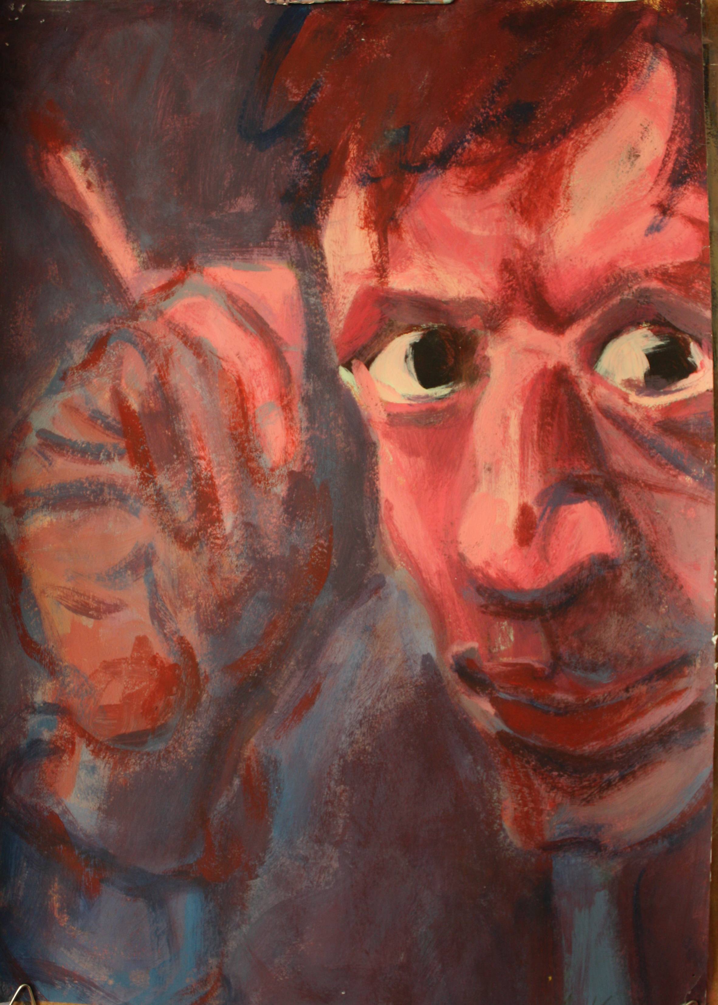 Obraz emanuje intensywnymi kolorami, gdzie dominują czerwienie i przytłumione niebieskie tony. Każdy pociągnięcie pędzla jest wyraźne, niemal chaotyczne, co nadaje kompozycji ekspresjonistycznego stylu. Twarz na pierwszym planie, z wyrazistymi oczami patrzącymi z determinacją, zapada w pamięć. Wystawiony palec wskazuje, jakby chciał coś wyrazić. To jakby malarz uchwycił moment pełen intensywnych emocji. Atmosfera jest napięta, a może nawet nieco groźna. Ten chaos barw i zamaszystość ruchu pędzla potęgują uczucie niepewności. Tu nie ma miejsca na przypadkowość. Każdy detal jest świadomie zaniedbany, pozostawiając widza z uczuciem rozedrgania. "Look at me!" – zdają się krzyczeć oczy obrazu. Artysta używa techniki współczesnej, z naciskiem na ekspresję i natychmiastowość. To sztuka, która mówi więcej niż tysiąc słów, zmuszając do refleksji nad ulotnością chwili. Patrząc na obraz, można odczuwać ciekawość. Może to ciekawość o co chodzi w tym spojrzeniu, lub co artysta dokładnie miał na myśli. Może to nawet tworzyć rodzaj zagadki. Emocje? To takie połączenie niepokoju z fascynacją. Wywołuje myśli o metaforach codziennego życia, o tym, jak niewiele trzeba, by świat stanął na głowie. Mamo! Ten pan ma wielkie oczy! – powiedziałby mały przedszkolak. I faktycznie, coś w tym jest. Bo te oczy, one śledzą każdy twój ruch zza płótna, próbując uchwycić ciebie w tym samym intensywnym momencie, który zamroził artysta.