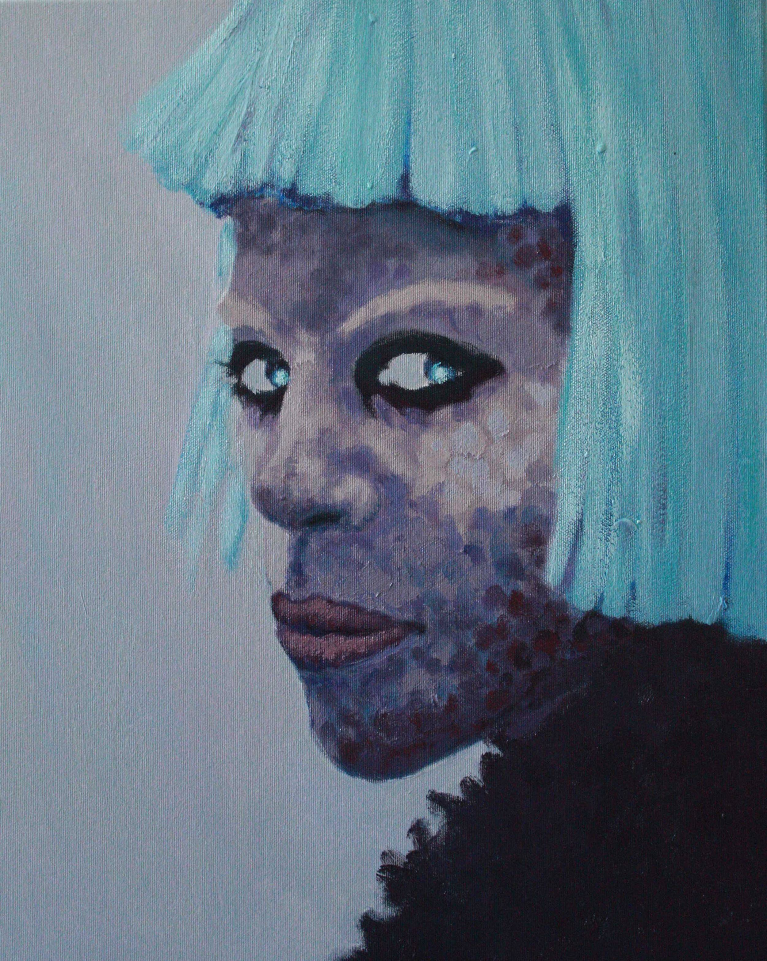 Obraz przedstawia futurystyczną postać o hipnotyzującym spojrzeniu. Wzrok przyciąga wyjątkowa gama barw: od chłodnych błękitów po kontrasty między ciemnymi a jasnymi odcieniami na twarzy. Postać ma fryzurę o intensywnie turkusowym kolorze, który tworzy ciekawy kontrast z jej skórą o fioletowym, niemalże łuskowatym wyglądzie. Wyraziste oczy, podkreślone czarną kreską, zdają się przenikać obserwatora. Kompozycja jest przemyślana, z postacią umieszczoną centralnie, co nadaje obrazowi harmonijną strukturę. Atmosfera dzieła jest nieco tajemnicza i niepokojąca. Artysta zastosował techniki, które przypominają nieco pointylizm, z drobnymi kropeczkami grupującymi się, by stworzyć wrażenie tekstury. Styl malarski sugeruje, że artysta eksploruje granice między realizmem a fantazją. Jak dodała bym, to coś z future world. Obraz może budzić skomplikowane emocje. Z jednej strony fascynacja, z drugiej lekki niepokój. Postać wydaje się być zarówno piękna, jak i dziwaczna, co sprawia, że ​​zastanawiamy się nad jej historią i miejscem w świecie. Trochę straszy, a trochę jest cool. Dla siedmiolatka: ta pani wygląda jak z bajki o kosmosie. Czy to istota z innego świata, czy może nasza przyszłość w innym świetle?