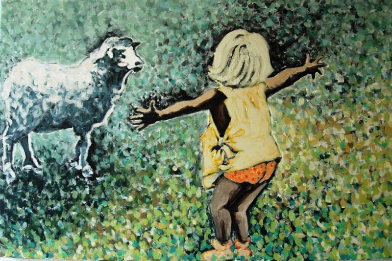 Obraz przedstawia małe dziecko w żółtej sukience, które z otwartymi ramionami stoi naprzeciw białej owcy. Tło jest pełne zieleni, w tonacjach od jasnych do ciemnych odcieni, co nadaje dziełu żywy, wiosenny charakter. Kolory są stonowane, ale jednocześnie kontrastujące, co przyciąga wzrok widza. Kompozycja jest prosta, ale pełna dynamiki i emocji, dzięki otwartemu gestowi dziecka i jego radości z kontaktu z naturą. Atmosfera obrazu jest ciepła, pełna niewinności i autentycznej dziecięcej radości. Artysta zastosował technikę pointylizmu, tworząc iluzję ruchu i życia poprzez drobne, kropkowane pociągnięcia pędzlem. Dziecięcy gest otwartości wydaje się niemal „touching”, przypominając nam o prostych przyjemnościach. Obraz wywołuje emocje radości i spokoju. Można poczuć tę beztroskość dzieciństwa, kiedy to świat wydaje się nieskończonym placem zabaw. „Owca wygląda, jakby chciała się bawić” – pomyślałoby pewnie dziecko. Każda plama farby wydaje się być celowo umieszczona dla podkreślenia tej beztroski i naturalności. Personalnie, patrząc na ten obraz, przypomina mi się czas spędzony na wakacjach na wsi. Może i technicznie artysta nie jest perfekcyjny, ale zdecydowanie uchwycił esencję chwili.