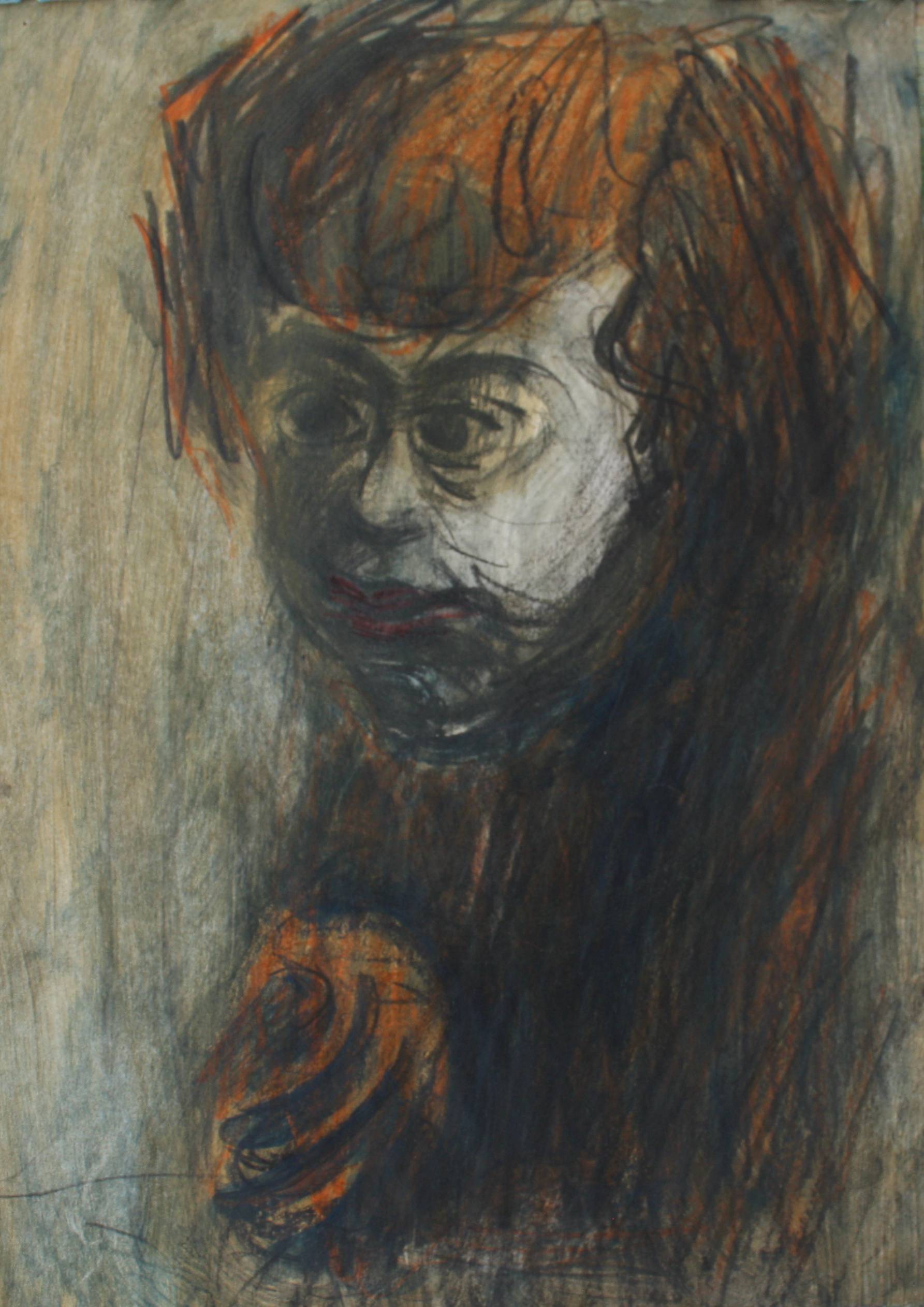 Na obrazie widzimy twarz wyróżniającą się na tle ciemniej smugi kolorów. Dominują ziemiste odcienie brązu i czerni, które przenikają się z pomarańczowymi akcentami tworzącymi dynamiczne gry światła. Linie są mocno zaznaczone, dając całości niemal surrealistyczny charakter. Wygląda jakby postać miała zamiar się ruszyć, ale została schwytana w czasie. Nastrój jest nieco tajemniczy, wręcz melancholijny, jakby osoba na obrazku coś skrywała. Styl artystyczny sprawia wrażenie szkicu, gdzie ekspresyjne pociągnięcia ołówkiem nadają twarzy głębi i charakteru. Czuję, że artysta użył techniki mieszanej, łącząc różne media i faktury. Można odnieść wrażenie, że artysta chciał oddać nie tylko wygląd, ale i wewnętrzne emocje postaci. Moje serce trochę przyspiesza patrząc na ten obraz, bo przypomina mi jesienne wieczory, kiedy słońce chowa się za horyzontem. "It's like magic!" powiedziałoby dziecko, widząc te kolory i kształty. Jest coś niepokojącego, a jednocześnie hipnotyzującego w tej pracy. Gdy się przyjrzymy, być może każdy z nas odkryje w niej coś własnego, osobistego.