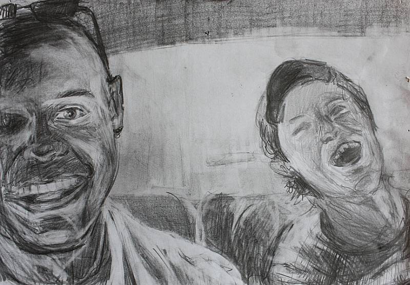 Na tym czarno-białym rysunku od razu przyciąga wzrok intensywna emocja na twarzach dwóch osób. Pierwsza postać na lewo ma szeroki uśmiech, a rysunki cieni i linii dodają jej twarzy głębi i życia. Druga figura, po prawej, wybucha śmiechem, a energia emanująca z jej twarzy niemal przeskakuje poza ramy obrazu. Dynamika zestawienia tych dwóch osób nadaje kompozycji ruchu, mimo że wszystko zostało wykonane za pomocą prostych kresek ołówka. Całość tchnie radością i beztroską chwilą – jak letnie popołudnie spędzone z najbliższymi. „Can you feel the joy?” zdaje się pytać obraź. Styl artystyczny jest niezwykle ekspresyjny, bazujący na szkicu i żywej kresce. Linie są nieco chaotyczne, ale dzięki temu wzmacniają wrażenie spontaniczności i ulotności chwili. Moje serce skacze z radości, widząc taką czystą i nieskrępowaną emocję. Artysta zręcznie posłużył się technikami kontrastu i cienia, by nadać głębi i dynamiki całej scenie, tworząc niemalże wrażenie trzech wymiarów na płaskiej powierzchni. Ten obraz wywołuje uśmiech i ożywia w umyśle wspomnienia podobnych chwil. Wyobrażam sobie, że tak mógłby śmiać się mój przyjaciel, po dobrej dawce głupich żartów i słonecznych promieni. Wzruszenie miesza się z nostalgią. Patrząc na twarze tych ludzi, czuję się tak, jakby świat był prostszy, a każda chwila pełna była radości. I to jest tak super, że aż chce się samemu śmiać!