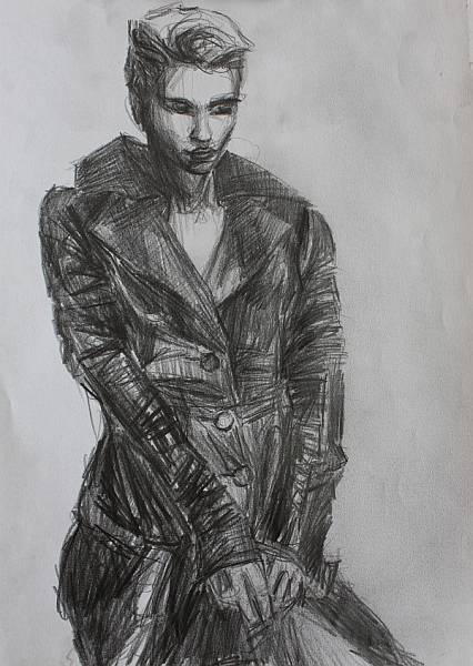 Na tym obrazie widzimy postać ujętą w czarno-białej kompozycji, przesiąkniętą nostalgicznym klimatem. Dominują odcienie szarości, które w połączeniu z miękkimi, choć wyraźnymi kreskami potrafią wywołać poczucie melancholii. Artysta z dużą swobodą posługiwał się techniką szkicu ołówkiem, co nadaje pracy lekkości i spontanicznego wyrazu. Ubranie bohatera, z wyraźnie zaznaczonymi fakturami i cieniami, przyciąga wzrok. Wygląda na zamyślonego, może trochę zmartwionego? Nie wiem, ale to mi przypomina, jak piesek zgubił ulubioną piłeczkę i zrobiło mu się smutno. Taka głęboka zaduma wyczuwalna jest w całej kompozycji. Postać spogląda przed siebie z kontemplacją, jakby trochę lost in thought. To może być odzwierciedlenie tęsknoty za czymś nieuchwytnym. Widoczne jest mistrzowskie operowanie światłocieniem pozwalające oddać trójwymiarowość. Choć obraz niewątpliwie jest skromny w formie, oferuje szerokie pole do refleksji i interpretacji. Daje odbiorcy możliwość wniknięcia wgłębi przedstawionej chwili, zatrzymania się na chwilę w pędzie codzienności.