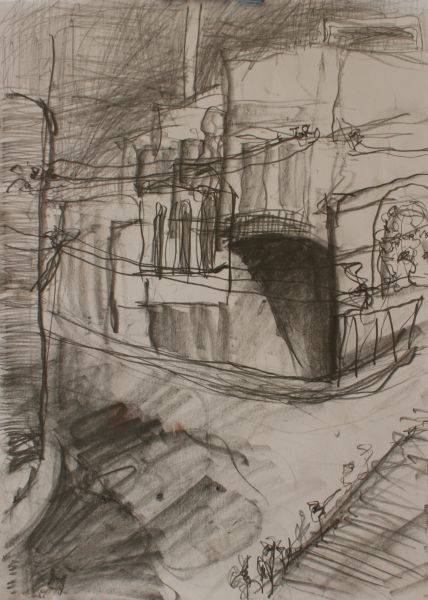 Obraz przedstawia intrygującą miejską scenerię, zanurzoną w odcieniach szarości, które wciągają widza w głąb uliczek pełnych tajemnic. Linie są dynamicznie krzyżujące się, niczym splątana sieć pajęcza, tworząc chaotyczny, a jednocześnie fascynujący układ, który przyciąga wzrok. W centrum kompozycji dominuje ciemny, tajemniczy łuk, przypominający przejście do innego świata. Całość jest owiana lekką mgiełką, sugerującą upalne letnie popołudnie lub poranek tuż po deszczu. Atmosfera emanująca z tego dzieła jest pełna tajemnicy, może trochę nostalgiczna. To miejsce, które widziało wiele historii, ale milczy o nich, ukryte w nielicznych cieniach i skrawkach światła. Artystyczny styl, w którym wykonano rysunek, to mieszanka surowości i delikatności, która sprawia, że obraz zdaje się być żywy, wibrujący energią miasta. Technika szkicu jest niedbała, lecz celowa, co dodaje autentyczności. Emocje, które może wywoływać ten obraz, są różnorodne: od zaciekawienia, po pewną tęsknotę za miejscami, w których byliśmy kiedyś. Dla dziecka scena ta może być przerażająca, bo schody są strome i ciemne, a przecież w ciemności mieszkają potwory! Przyglądając się dłużej, można poczuć lekki dreszczyk ekscytacji, jak przed odkrywaniem czegoś nieznanego. W tym chaosie architektonicznym jest coś "wild". A jakie to uczucie, gdy patrzysz na ten obraz? Może skłania do refleksji nad własną drogą, niezbadanymi uliczkami, które jeszcze przed tobą. Albo po prostu cieszysz się chwilą zadumy nad niezwykłością prostych miejsc.