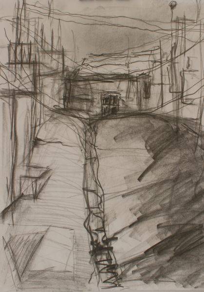 Obraz prezentuje pejzaż miejski uchwycony za pomocą węgla. Dominuje tu kolor szary, a całość jest utrzymana w monochromatycznej skali. Linie są czasami niepewne, jakby artysta rysował je w pośpiechu, a niektóre kształty na pierwszy rzut oka wydają się chaotyczne. Kompozycja jest dość dynamiczna, z centralnym punktem w oddali, być może mostem, który przyciąga wzrok. Atmosfera jest nieco tajemnicza, a może nawet melancholijna. To jeden z tych obrazów, który ma w sobie coś z "mglistego poranka". Styl rysunku przypomina mi urban sketching, bardziej cotta, niż regularna szkice architektoniczne. Artysta użył technik cieniowania, by nadać głębię i kontrast, co tylko potęguje tajemniczość, jakby urban escape. Można poczuć jak migoczą emocje, może smutek, może zaduma nad mijającym czasem. Ale też coś w rodzaju spokoju, jak wtedy, kiedy patrzysz na deszcz za oknem. To taki obraz, który prowokuje do refleksji – co czujesz, patrząc na niego? "Nie wiem, ale jest ciemno i cicho" – mogłoby powiedzieć dziecko. Wzbudza jakąś tęsknotę, może za miejscami, które nigdy nie odwiedziłem, ale które noszę w sercu. Naprawdę, this image doesn't let you be indifferent.