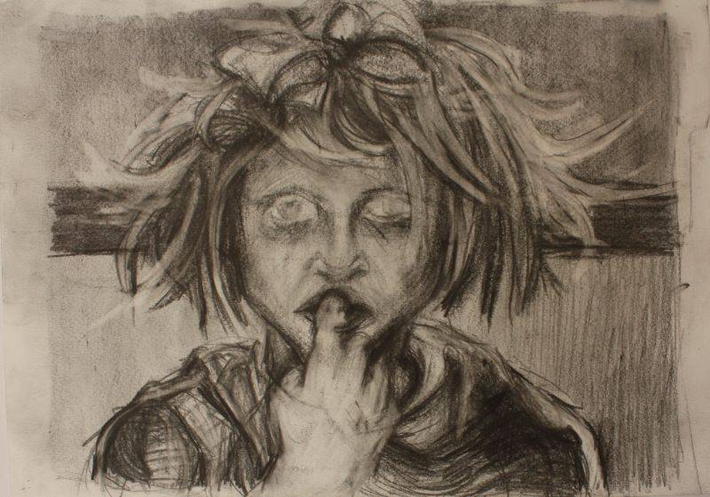 Obraz przedstawia postać z rozwichrzonymi włosami i nieco nieobecnym spojrzeniem. Dominują ciemne, melancholijne odcienie szarości, co dodaje tajemniczości i sprawia, że całość jest trochę przytłaczająca. Kreska jest ekspresyjna, a kompozycja sugeruje pewien niepokój. Postać zdaje się być zamyślona, może nawet zagubiona. Styl rysownika emanuje surowością, a technika użycia ołówka sprawia, że forma jest płynna i dynamiczna. Atmosfera obrazu jest pełna pewnej dziwaczności. Można poczuć się jak w nieznanym świecie, pełnym ukrytych znaczeń. Dzieło może budzić refleksje na temat ludzkiego doświadczenia i emocji. Jest w nim też coś z wyrafinowanej prostoty, co sprawia, że mimo szorstkości, obraz jest "fascinating". Patrzę na ten obraz i myślę: "Wow, co ona takiego widzi?". Wygląda jak bohaterka z innej rzeczywistości, gdzie wszystko jest trochę krzywe. Może to okno do jej duszy, kto wie? W każdym razie, wywołuje we mnie ciekawość i lekką melancholię. To sztuka, która nie boi się być surowa i bezpośrednia, angażując widza na subtelniejszym poziomie. Pozostawia nas z myślą, czy wewnętrzny chaos może być równie piękny, jak harmonia.