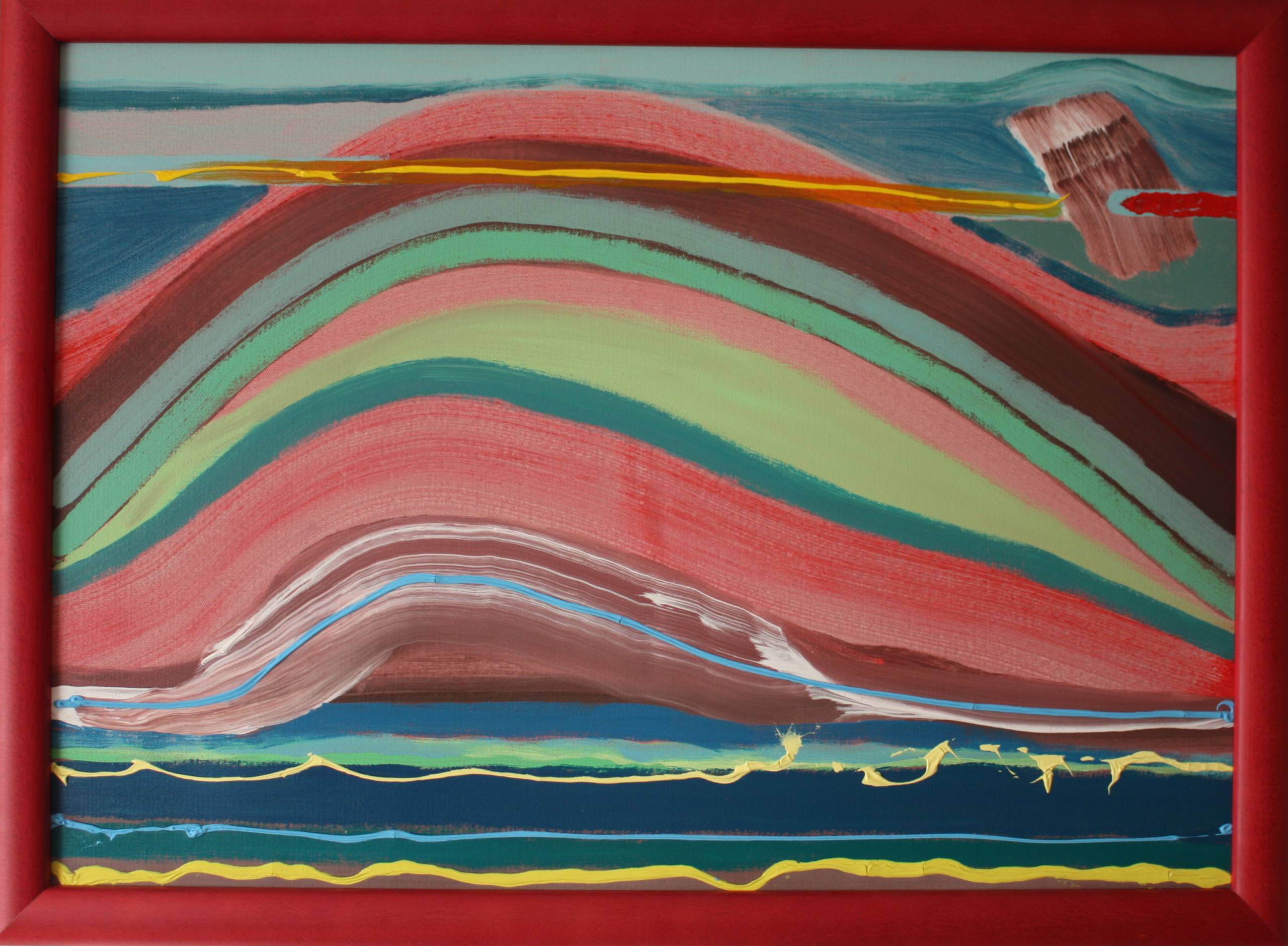 Obraz osadzony w czerwonej ramie, przyciąga wzrok swoją żywiołową paletą barw. Dominują tu zakrzywione pasy w odcieniach czerwieni, zieleni i niebieskiego, przecinające płótno niczym krajobraz z dziecięcych snów. Każdy kolor jest jak oddzielna fala, tętniąca ruchem i energią. Jest coś magicznego w tej kompozycji, co przywodzi na myśl wschód słońca nad abstrakcyjną doliną. Artystyczny styl to zabawa formą i kolorem, z pędzlem pozostawiającym ślady jak piasek na plaży. Widz może błądzić wzrokiem po pastelowych wzgórzach i górkach, a jednocześnie odczuwać spokój, jakby obracał się świat powoli wokół. To jest ten moment, kiedy czas przestaje istnieć. Ja patrzę i czuję się, jakbym dotknął oceanu kolorów. Wszystko to składa się na niepowtarzalny visual symphony obrazu. Dzieciak powiedziałby: "To wygląda jak cukierki!". Może to jest właśnie najpiękniejsza metafora - słodki, barwny świat zamknięty między czterema ramami.
