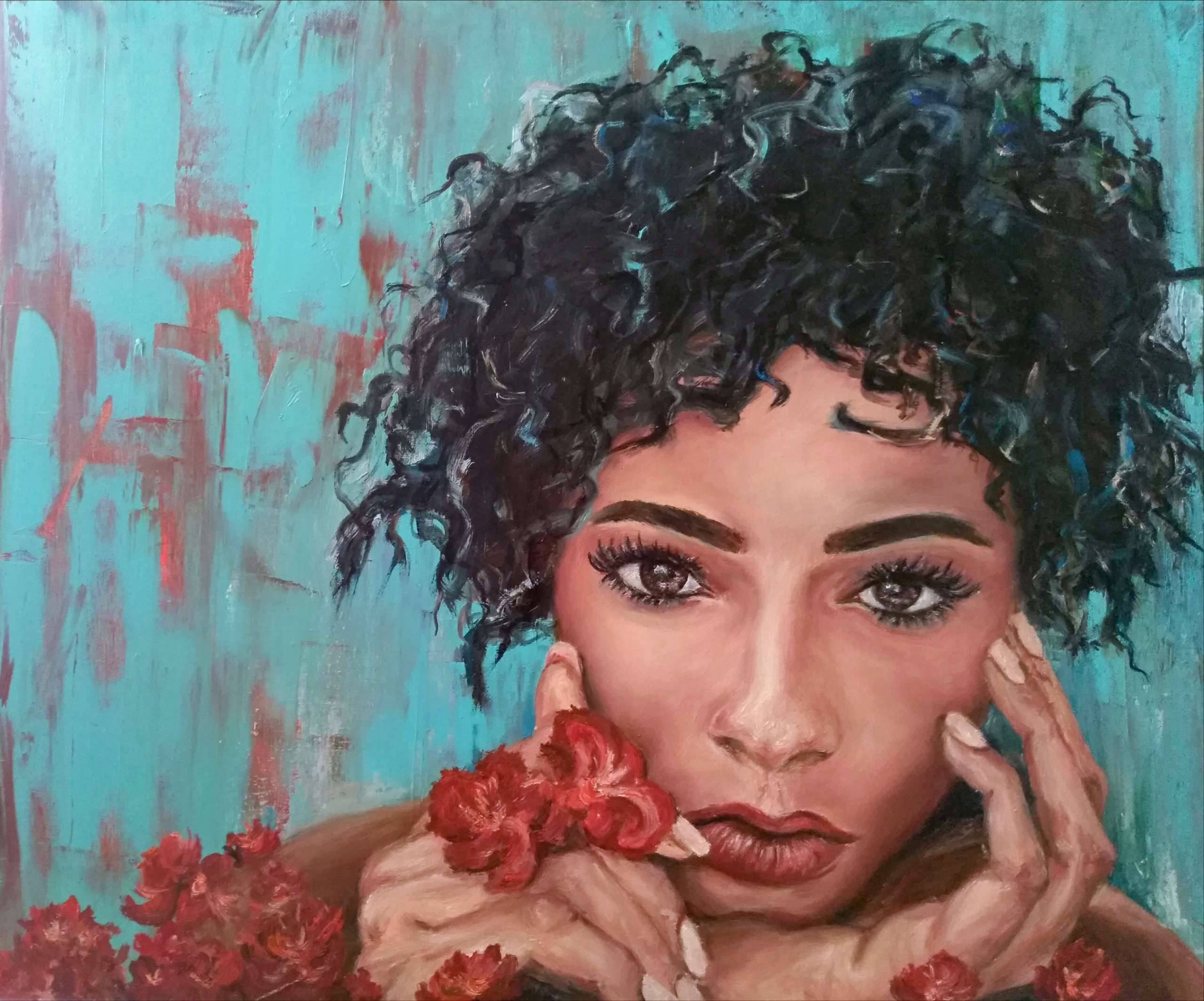 Obraz to ucieleśnienie fascynacji kolorami i emocjami. Dominująca turkusowa barwa tła tchnie w dzieło pewną świeżość i spokój, kontrastując z ciemnymi lokami kobiety na pierwszym planie. Te czarne, kręcone włosy, niczym fale nocnego oceanu, zdają się pląsać w rytm swojej własnej melodii. Artystka z wprawną ręką miesza impasto z delikatnymi pociągnięciami pędzla, co nadaje całości dynamiki. Czyż nie są te oczy niesamowite? Patrzą głęboko, jakby chciały opowiedzieć historię niewypowiedzianej tęsknoty. Jej spojrzenie jest tak pełne emocji, że niemal można usłyszeć bijące serce. Dziecko pewnie by powiedziało: "Patrzy tak, jakbym ukradł jej ciasteczko". Kompozycja wprowadza nas w stan chwilowej melancholii, pośród czerwonych kwiatów, które przypominają o przemijalności. Moment refleksji jest tu naprawdę touchy. Artysta bawi się kontrastem, jakby chciał powiedzieć, że w każdej chwili piękno i smutek mogą być ze sobą splecione. Ten obraz to nie tylko odzwierciedlenie wizualnej estetyki, lecz także głęboka zachęta do wewnętrznego dialogu. Każdy widz może odnaleźć w nim cząstkę siebie. Osobiście czuję się poruszony, jakbym był świadkiem cichego monologu, który mimo swej kruchości ma niebywałą moc.