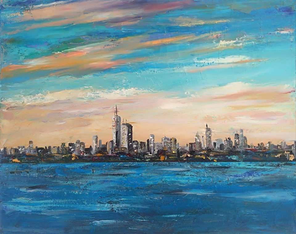 Na obrazie widzimy malowniczą panoramę miasta otoczonego przez spokojny, granatowy ocean. Kolory nieba płynnie przechodzą od ciepłych odcieni brzoskwini po zimne błękity, tworząc harmonijną syntezę, która niemalże tętni życiem. Wieżowce, pnące się ku górze, zdają się tańczyć z chmurami. Artysta zastosował swobodną technikę pędzla, dodając teksturę i głębię. Można wręcz poczuć, jakby miasto oddychało, żyło własnym "rhythm". Nastrój jest spokojny, a jednocześnie tchnie dynamicznością miejskiego życia. Obraz zachęca do refleksji, a jednocześnie uspokaja. Patrząc na to dzieło, można się zamyślić. Czy to marzenie o nowym horyzoncie, czy tęsknota za chwilą wytchnienia? Dziecko powiedziałoby: "To miasto w chmurach!". Osobiście, patrząc na te kolory, czuję, jakby czas stanął w miejscu. Całość bryluje w klimacie optymizmu i nadziei. To wspaniałe połączenie sztuki i emocji, które każdy może interpretować na swój sposób.