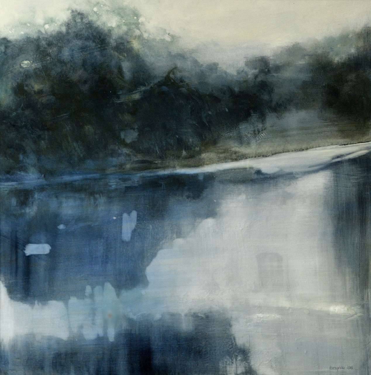 Obraz przedstawia nastrojowy pejzaż, w którym królują odcienie granatu, szarości i bieli. Kompozycja jest rozmyta, jakby zanurzona w gęstej mgle, co nadaje jej tajemniczy wygląd. Górna część obrazu przypomina delikatnie falujące drzewa, które odbijają się w spokojnej tafli wody poniżej. Artysta zastosował technikę rozmycia, która dodaje całości łagodności i nostalgiczną atmosferę. Kolory zdają się płynnie przenikać, podkreślając płynność i przemijanie. Obraz emanuje spokojem i skłania do refleksji. Czujesz, że czas tu zwalnia. Patrząc na to dzieło, można odnieść wrażenie, jakby zanurzało nas w sennej scenerii, gdzie przeszłość i teraźniejszość zlewają się w jedno. Wywołuje to uczucie zatrzymania chwili. Moment zawieszenia, jak powiedziałby ktoś: "It feels timeless." Children might say, "Tu jest bardzo dużo wody." Obraz ten może skłaniać do zadumy nad ulotnością momentów, a także przemijającą naturą życia. Stylistycznie przypomina impresjonizm przez uwagę na kolor i światło, choć jest bardziej abstrakcyjny. To mieszanina technik, która sprawia, że oglądając ten obraz, odczuwa się zarówno spokój, jak i pewne smutne zamyślenie. Jakby zdjęcie chwil zatrzymanych w bezruchu, dających nam szansę na chwilowe oderwanie się od rzeczywistości.