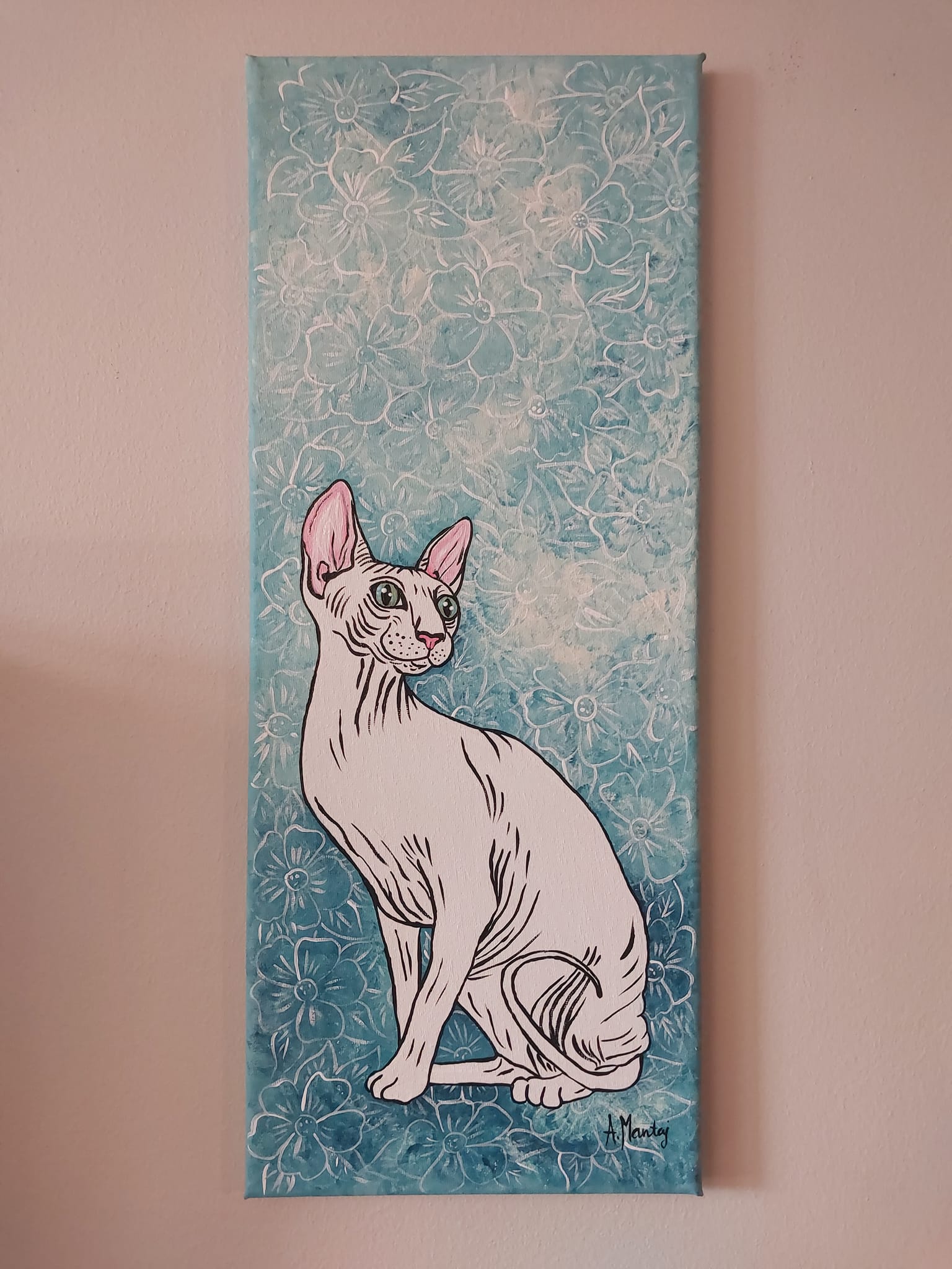 Obraz przedstawia elegancką sylwetkę kota rasy sfinks na tle cudownie niebieskiego nieboskłonu wypełnionego delikatnym wzorem kwiatów. To takie przyjemne dla oka połączenie barw! Kocur prezentuje się dumnie, jego blada skóra kontrastuje z intensywnymi odcieniami tła. Pastelowe róże uszu dodają mu miękkości i przytulności. Styl obrazu łączy w sobie nutę nowoczesności z subtelnością ilustracji. Artysta zastosował minimalistyczne linie i łagodne przejścia koloru. Technika mieszania dynamicznych florystycznych motywów z prostotą postaci wywołuje uczucie spokoju i harmonii. Atmosfera tego dzieła jest spokojna i medytacyjna, ale również troszkę tajemnicza. A może nawet magiczna? Patrząc na nie, czuję ciepło i nieodpartego przyciągania. Wyobraźnia podpowiada różne scenariusze - może ten kociak jest strażnikiem tajemniczego ogrodu? "Ten kotek jest super!" powiedziałoby dziecko. A może to tylko chwilowy kaprys artysty? Każdy znajdzie tutaj coś dla siebie, coś co poruszy w jego sercu struny emocji. Dla mnie ten obraz jest jak spokojna chwila w zgiełku dnia codziennego.