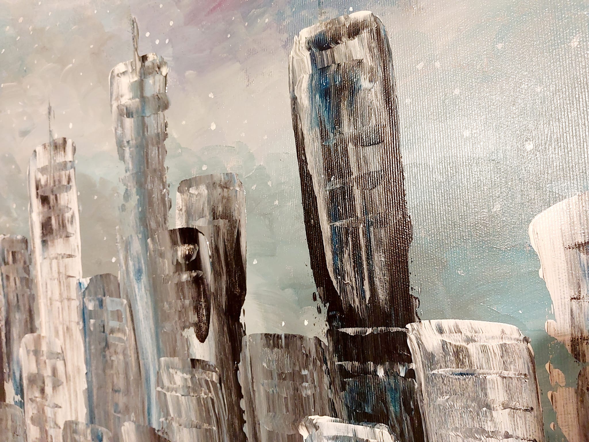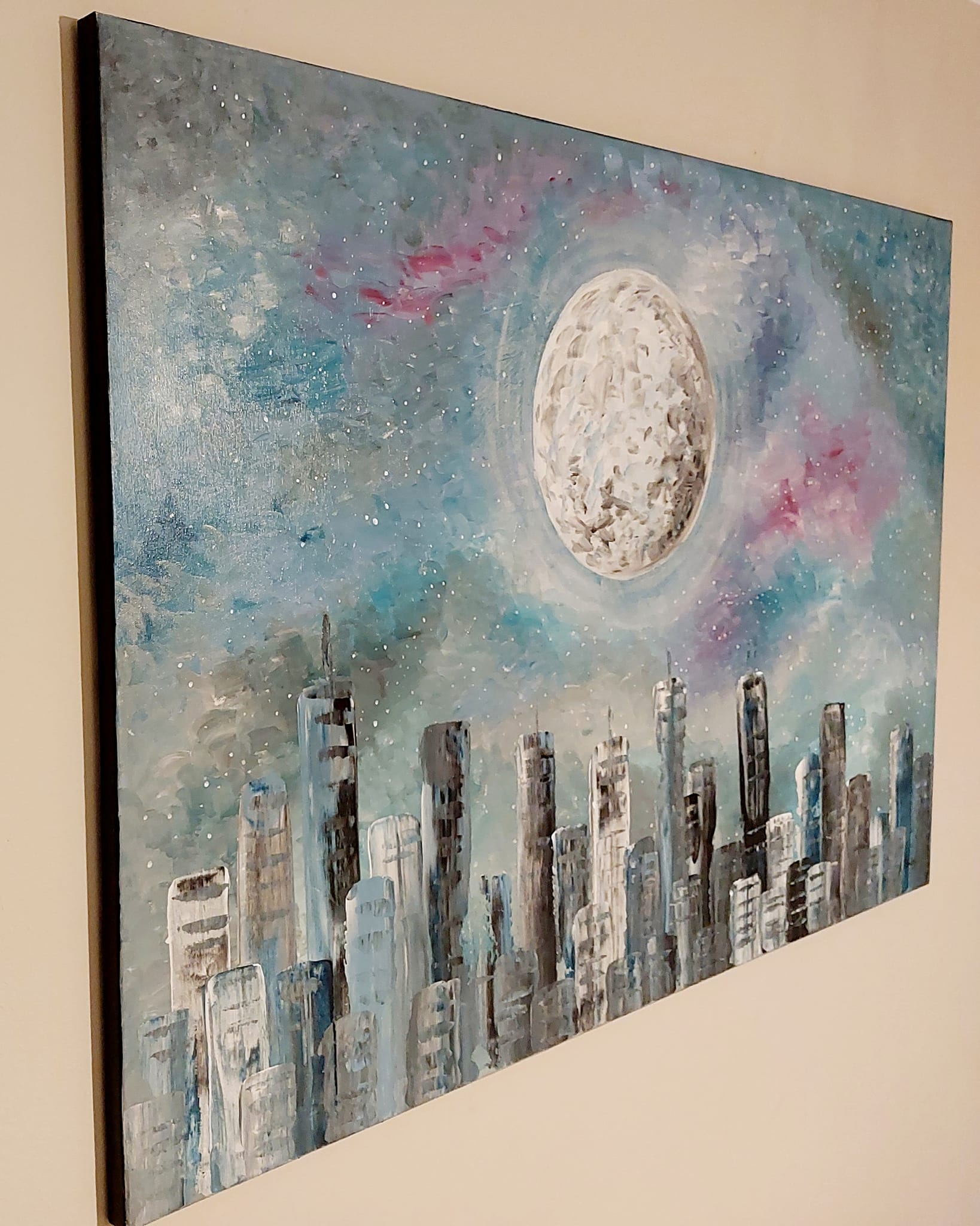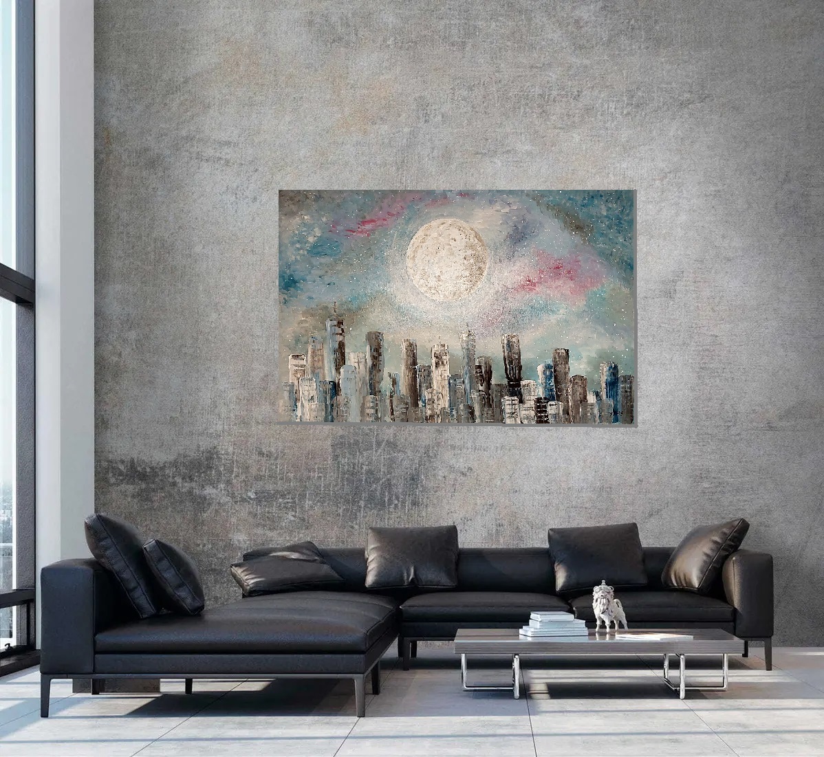 MOON CITY pięknie ozdobi ścianę w Salonie, gabinecie, sypialni... Koi i hipnotyzuje.