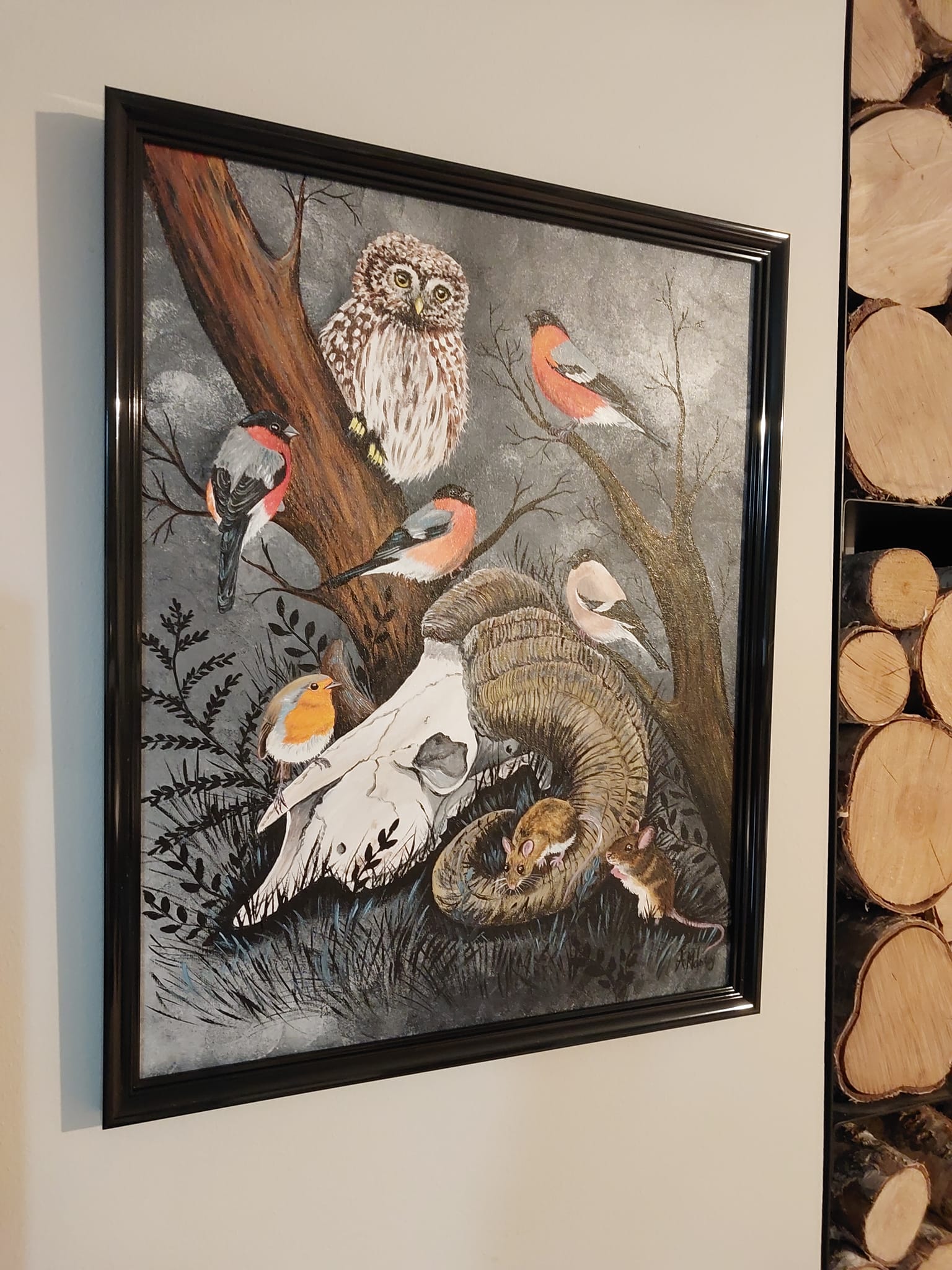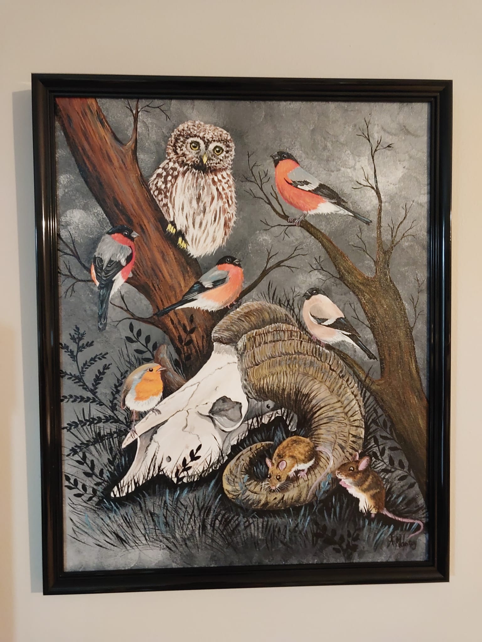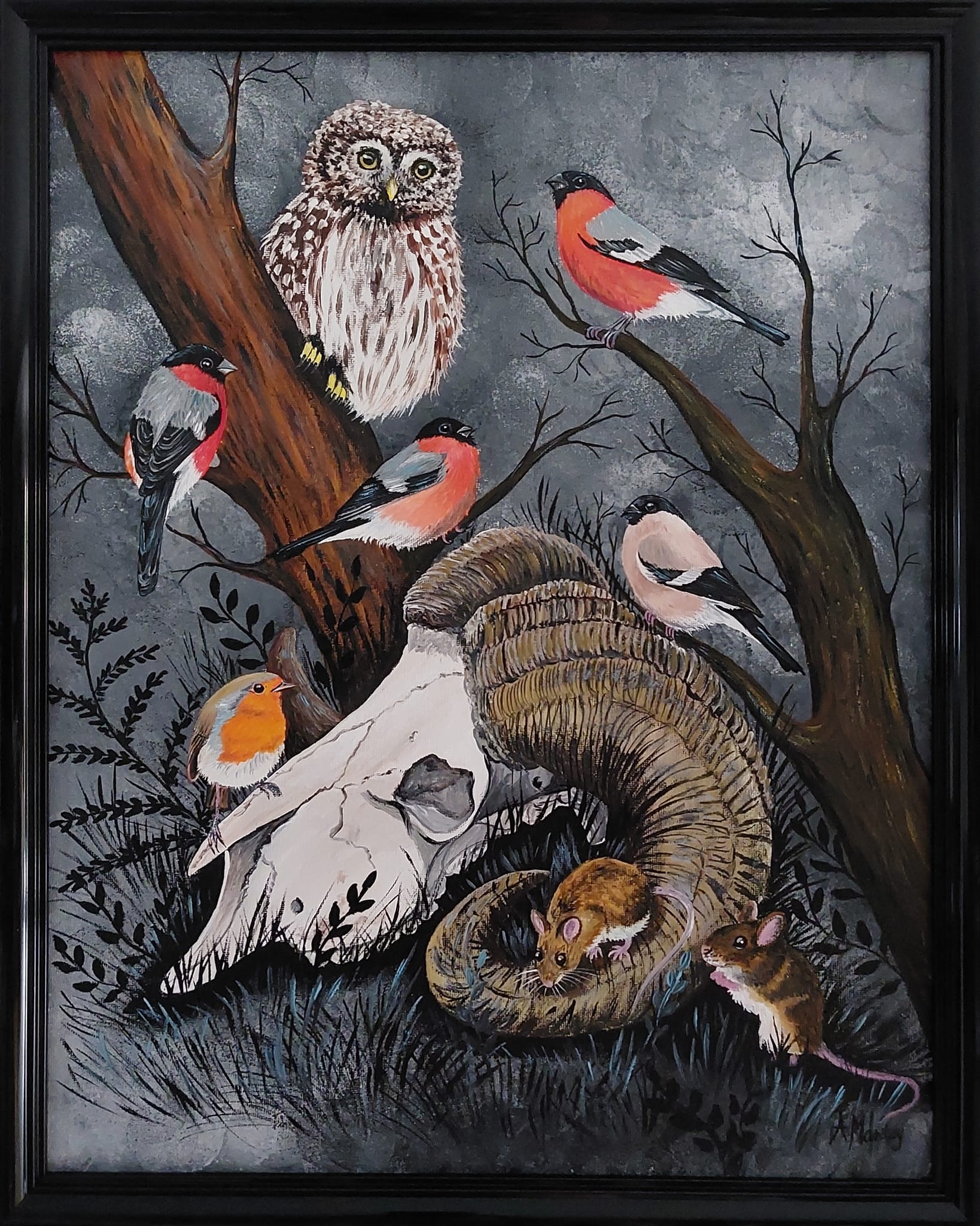 Agnieszka Mantaj - Czaszka muflona i ptaki