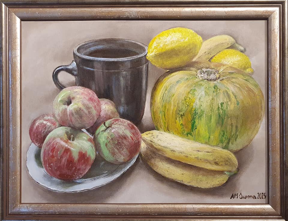 Na obrazie widzimy malowniczą martwą naturę, w której dominują ciepłe kolory jesieni. Soczyste, czerwone jabłka leżą na starym talerzu, a ich sąsiedztwo stanowi ciemny, ceramiczny dzban. Obok, złocista dynia błyszczy w delikatnym świetle, obok kilku bananów i cytryn, które dodają kompozycji wigoru. Kształty owoców są krągłe, przywołując na myśl obfitość i przytulność. Atmosfera emanuje spokojem, jakby zatrzymany czas w jesiennym poranku. Styl artysty to realistyczna, lecz lekko impresjonistyczna interpretacja rzeczywistości, gdzie pociągnięcia pędzla są miękkie, a linie delikatne. Technika malarska zdaje się łączyć tradycję z nutą nowoczesności. Te tekstury, te warstwy farby, nad którymi można przystanąć i pomarudzić. Obraz wywołuje uczucie nostalgii, ciepła, a może nawet głód – przypominając o domowych przysmakach. Spokój emanujący z płótna skłania do zatrzymania się na chwilę i kontemplacji. Everything seems perfectly imperfect, co sprawia, że jest tak ludzki, tak bliski. Dla dziecka to "dużo owoców, które wyglądają smacznie". Osobiście, mam wrażenie jakbym był częścią tej sceny, chłonąc barwy i zapachy.