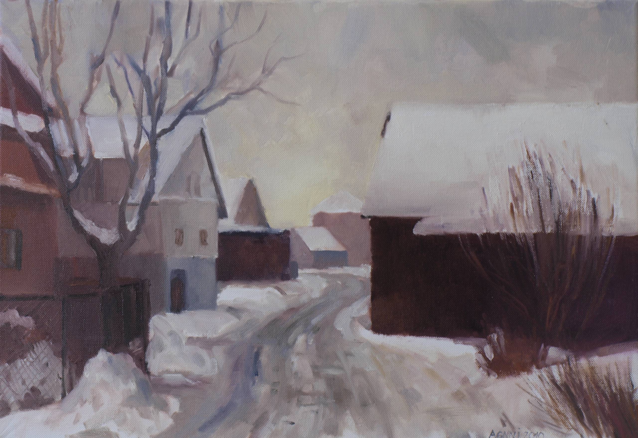 Obraz przedstawia zimową scenerię, która tchnie spokojem i ciszą. Widok pokrytej śniegiem wioski, ukazanej w subtelnych odcieniach bieli, szarości i bladego brązu, sprawia, że świat wydaje się zatrzymany w kadrze. Domy, niczym senne olbrzymy, stoją bez ruchu, a ich dachy pokrywa delikatna warstwa śniegu. Na pierwszym planie widzimy samotne drzewo, jego gałęzie są jak czarne linie na tle mlecznej bieli nieba. Światło jest rozproszone, co nadaje obrazowi soft glow, podkreślając jego nostalgiczną aurę. Styl artysty jest surowy, lecz niezwykle subtelny, przypominający akwarelowe malarstwo, chociaż obraz wykonano techniką olejną. Sposób, w jaki autor łapie esencję zimy, pokazuje mistrzostwo w balansowaniu koloru i kompozycji. Atmosfera obrazu może wywołać u widza uczucie tęsknoty za spokojnymi zimowymi dniami, kiedy czas płynie wolno, a cisza staje się namacalna. Dla mnie, patrzenie na ten obraz to jak ciepłe kakao po długim spacerze. Dziecko by powiedziało: "Śnieg wygląda jak wata cukrowa!" I rzeczywiście, całość wygląda jak z bajki, pełnej spokoju i magii, kiedy wszystko jest takie trochę zamglone i tajemnicze.