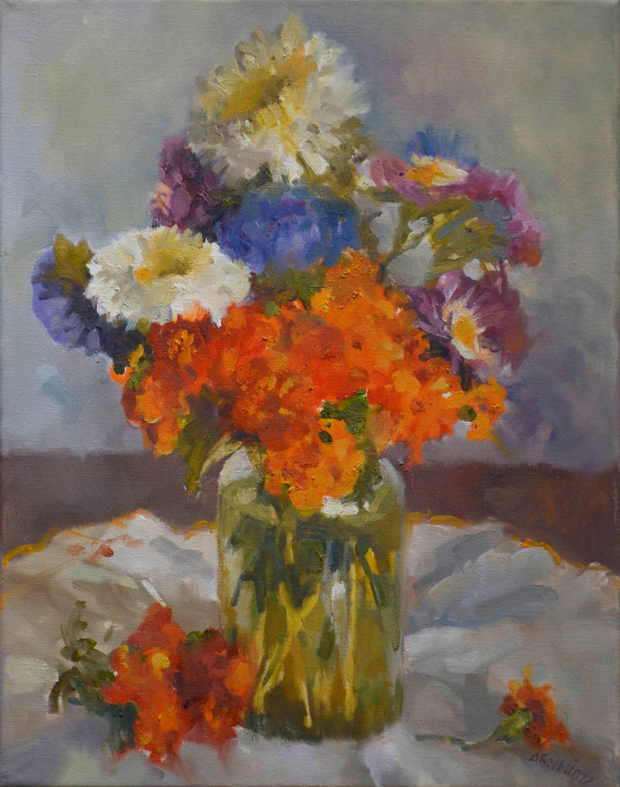 Na płótnie tętni feeria barw. Jasnopomarańczowe kwiaty wystrzeliwują z zielonego wazonu, kontrastując z delikatniejszymi białymi i fioletowymi odcieniami u góry. Całość kompozycji emanuje radością, ciepłem lata zamkniętym w szklanych ścianach. Smugi farb olejnych tworzą delikatne tekstury, sprawiając, że każdy płatek zdaje się być na wyciągnięcie ręki. Malarskie pociągnięcia są swobodne, rozmyte krawędzie dodają obrazowi nuty impresjonizmu, zachęcając do zatrzymania się na chwilę refleksji. Atmosfera dzieła jest spokojna, niemal sielankowa. Wywołuje to uczucie przytulności, jakby siedziało się w wiejskim domku, obserwując kwiaty na stole. Taki painting może obudzić sentyment, delikatne wspomnienie wakacji spędzonych na wsi. Artysta używa techniki impasto, grubymi warstwami farby budując objętość, co nadaje dziełu trójwymiarowej jakości. Pięknie grające ze sobą cienie i światła tworzą głębię, która zaprasza do zanurzenia się w tym małym świecie. "Wow, ile kwiatków" - mogłoby powiedzieć dziecko. Mieszanka kolorów promieniuje spokojem i harmonią, jak kojąca melodia w deszczowy dzień. Chciałoby się po prostu usiąść i patrzeć na to w nieskończoność, czerpiąc przyjemność z tej chwili. Myślę sobie, że to jest kwintesencja domowego ciepła. Totally mesmerizing. Obraz inspiruje, zachęca do zajrzenia we własne wnętrze i odczucia wdzięczności za ulotne momenty piękna w codziennym życiu.