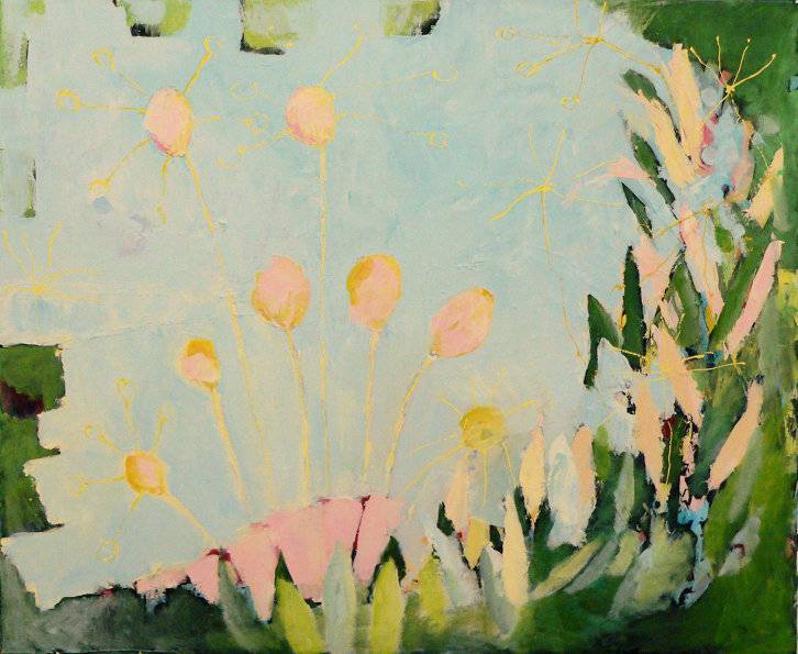 Pastelowa tafla błękitu zajmuje środek obrazu, otoczona gęstą zielenią jak ramą z miękkich krzaków. Z dołu wyrastają owalne pąki w różu i żółci, na cieniutkich żyłkach łodyg, a z prawej zbija się wachlarz liści w bielach, różach i szmaragdach. Kompozycja ma dużo powietrza, negatywna przestrzeń pulsuje jak ciche jezioro. Ja widzę balonki co lecą do nieba. Atmosfera jest łagodna, poranna, trochę senna, ale figlarna, jakby ktoś przed chwilą dmuchnął na mokrą farbę. Wydaje mi się że to akryl, szerokie plamy kładzione śmiało i kontury ryte cienką kreską, może patykiem, widać przetarcia i niechlujne smugi. Styl balansuje między abstrakcją a naiwnym ogrodem, niby luz, a jednak wszystko gra. Czuję ulgę i ciekawość, świat staje się soft. Kwiaty mówią o obietnicy i kruchości, o chwilach które przepływają szybciej niż chcemy. Chciałbym mieć to nad biurkiem, bo robi spokój i daje oddech, troche jak świeże okno w dusznym dniu.
