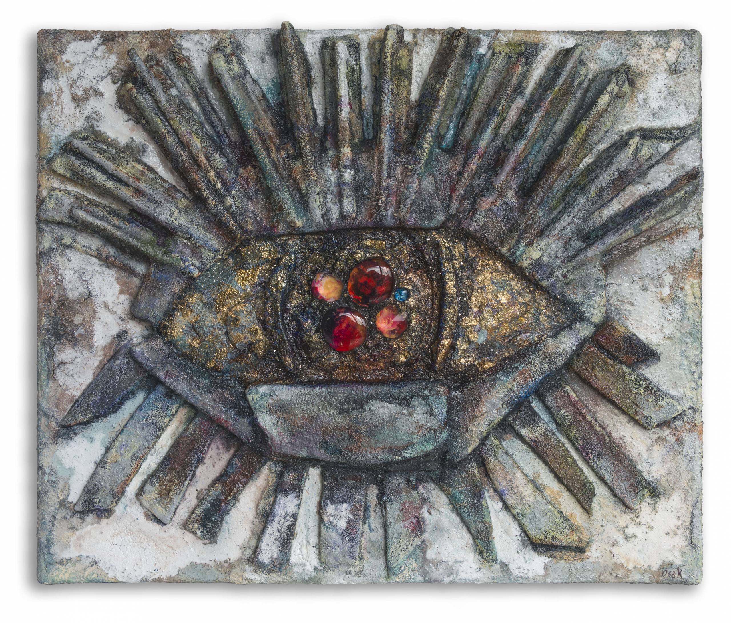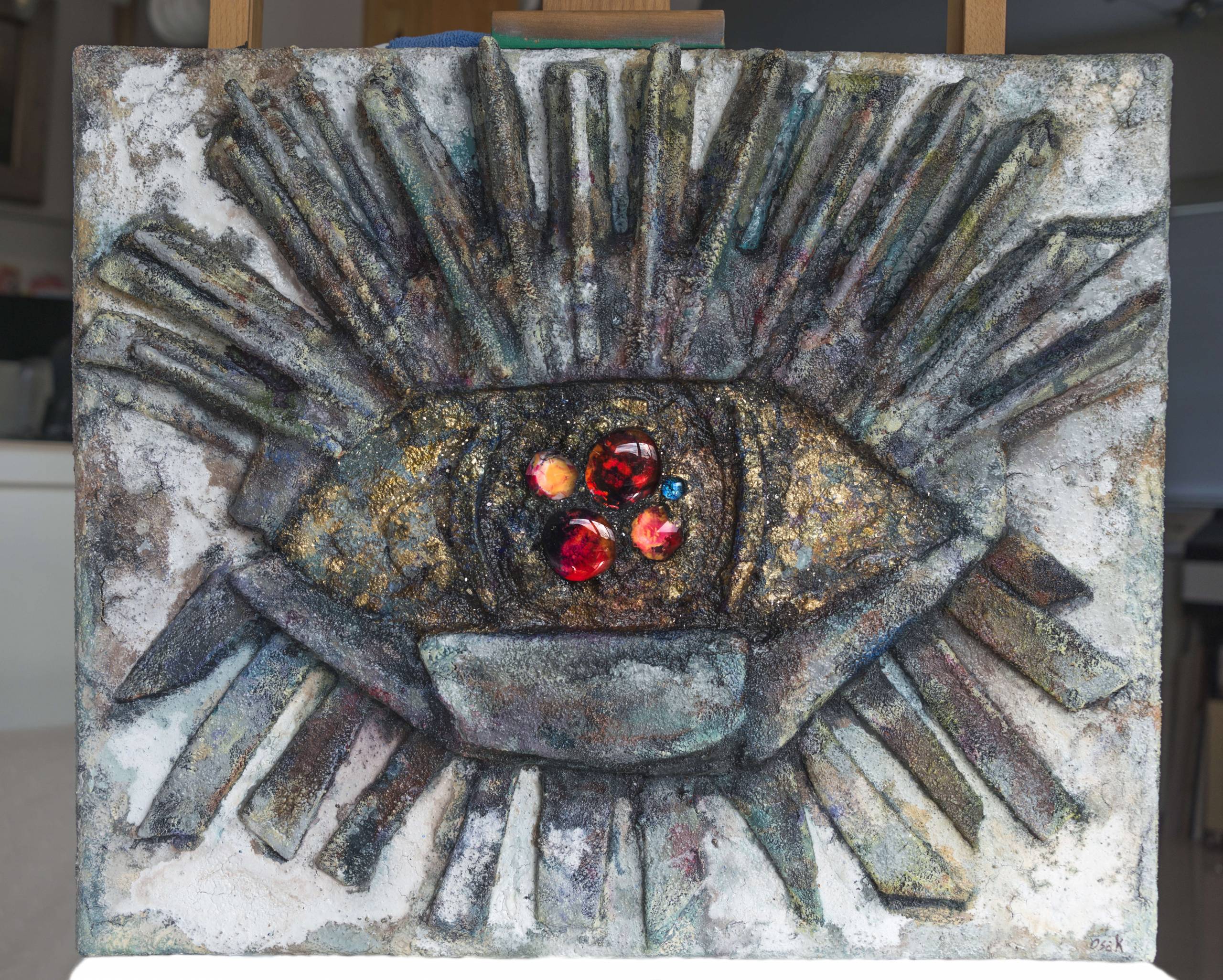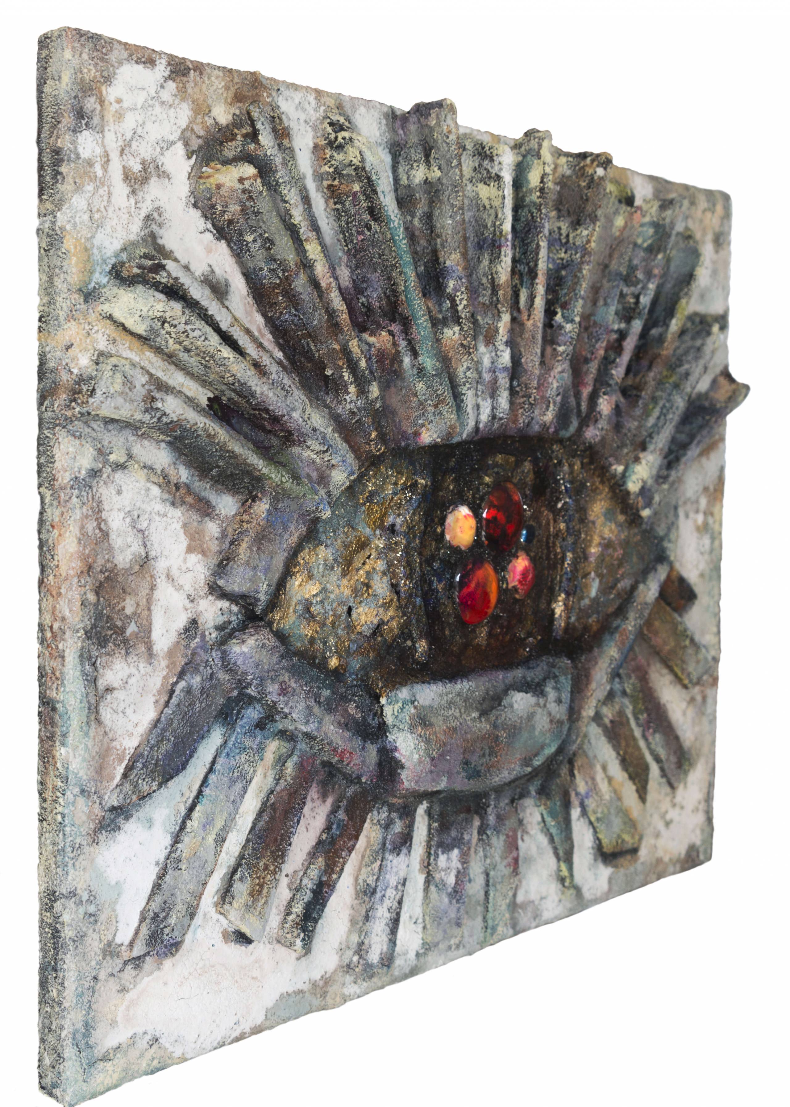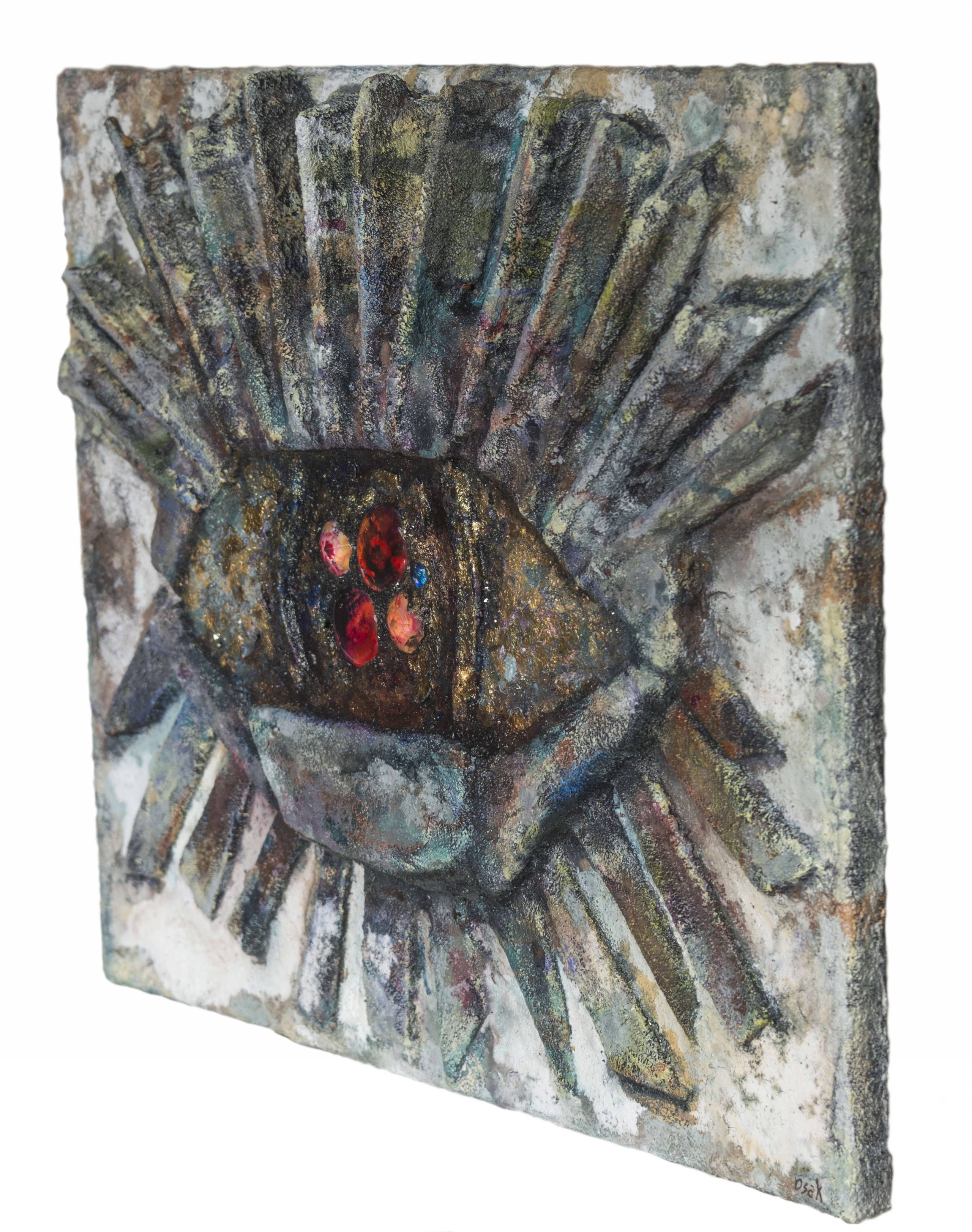 Dziki, prymitywny, prosto z budowli nieznanych jeszcze cywilizacji... Oko, które ma moc by zobaczyć i siebie. Fantastyczny i faktycznie mistyczny. Jak z innej epoki Tajemny...nieodgadniony Oto komentarze na temat pracy Kosmiczny Wizjer III, które oddają atmosferę tego co chciałam stworzyć. Kosmiczny Wizjer III jest to płaskorzeźba wykonana w technice mixed media. Pomalowana akrylami, z wtopionymi szkiełkami, pokryta złotymi płatkami, oraz drobinkami szkiełek, które pięknie odbijają światło. Pokryta werniksem zabezpieczającym kolory. Format 50 x 60 cm. Waga 3 kg.