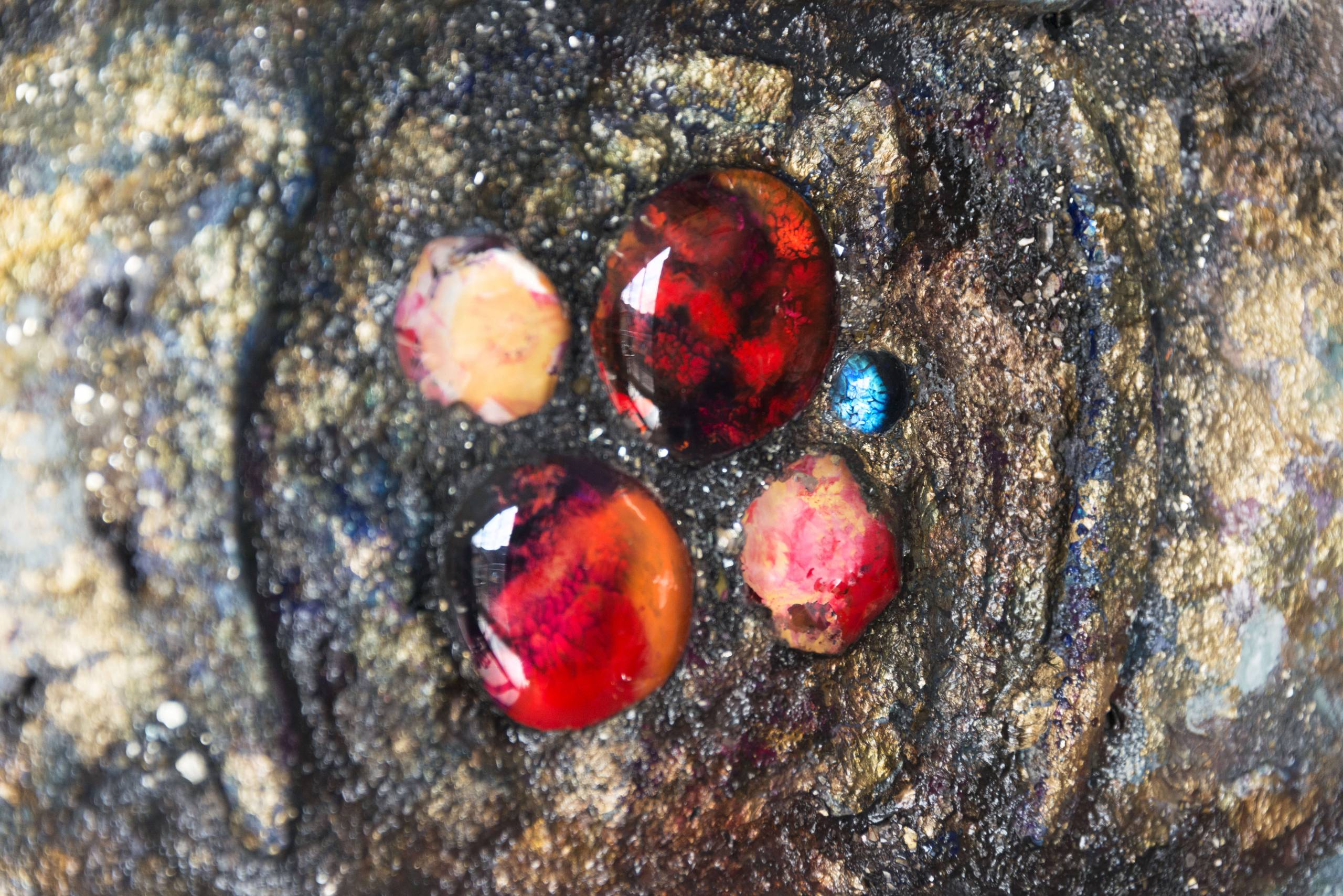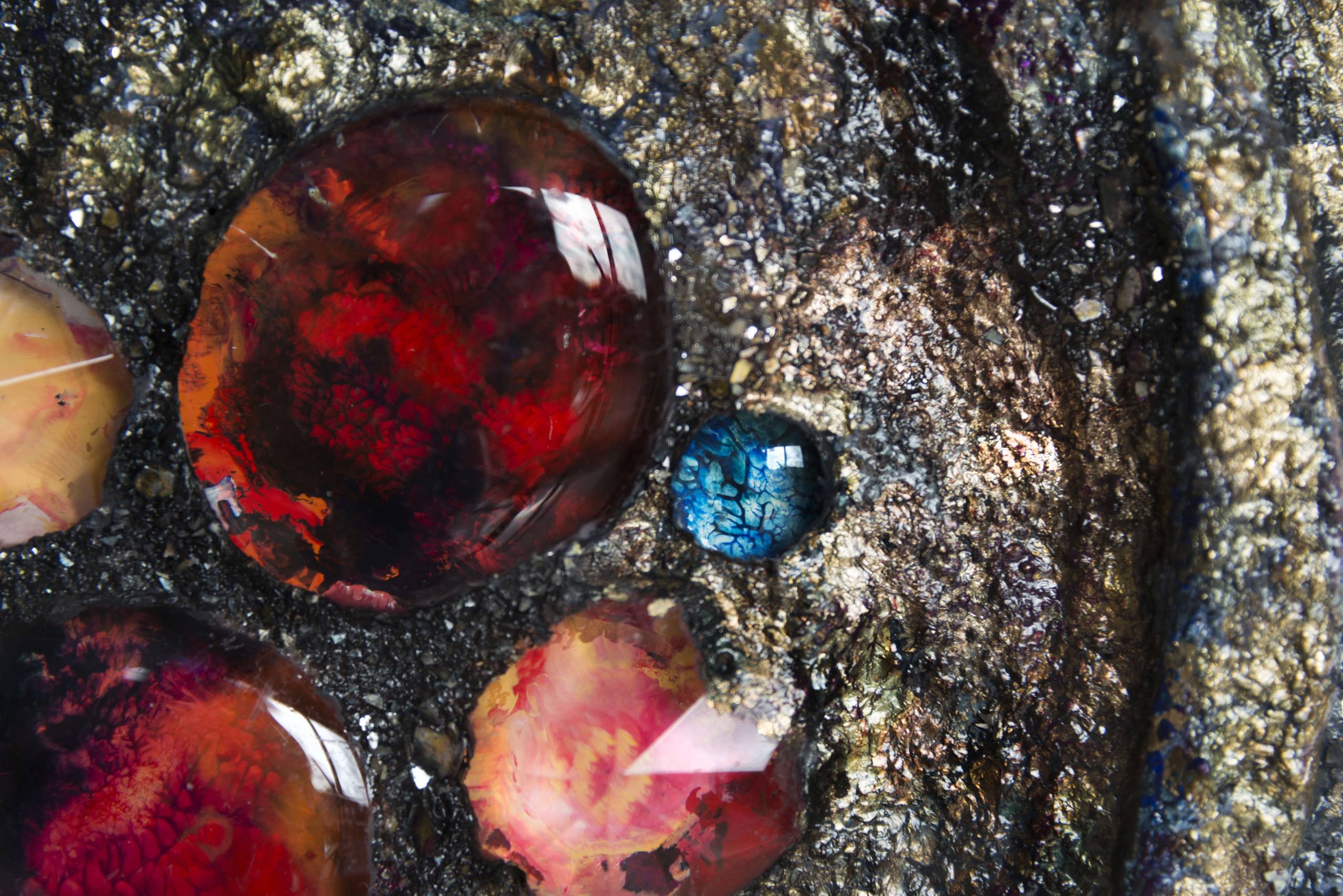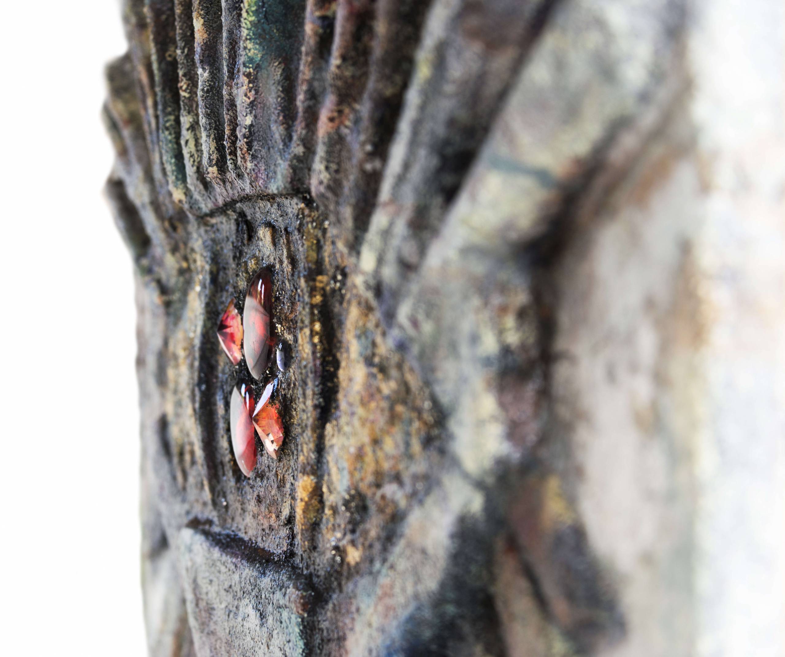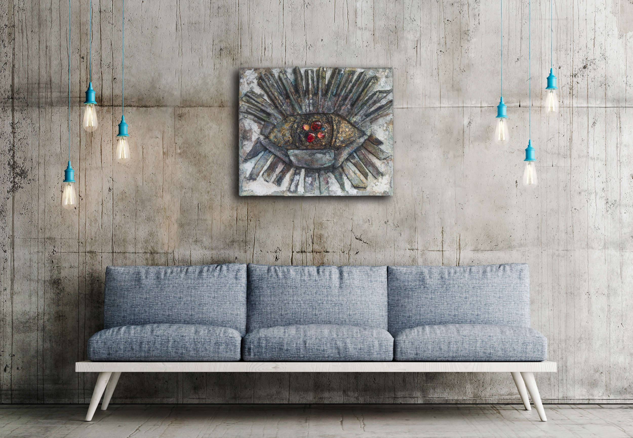 Dziki, prymitywny, prosto z budowli nieznanych jeszcze cywilizacji... Oko, które ma moc by zobaczyć i siebie. Fantastyczny i faktycznie mistyczny. Jak z innej epoki Tajemny...nieodgadniony Oto komentarze na temat pracy Kosmiczny Wizjer III, które oddają atmosferę tego co chciałam stworzyć. Kosmiczny Wizjer III jest to płaskorzeźba wykonana w technice mixed media. Pomalowana akrylami, z wtopionymi szkiełkami, pokryta złotymi płatkami, oraz drobinkami szkiełek, które pięknie odbijają światło. Pokryta werniksem zabezpieczającym kolory. Format 50 x 60 cm. Waga 3 kg.